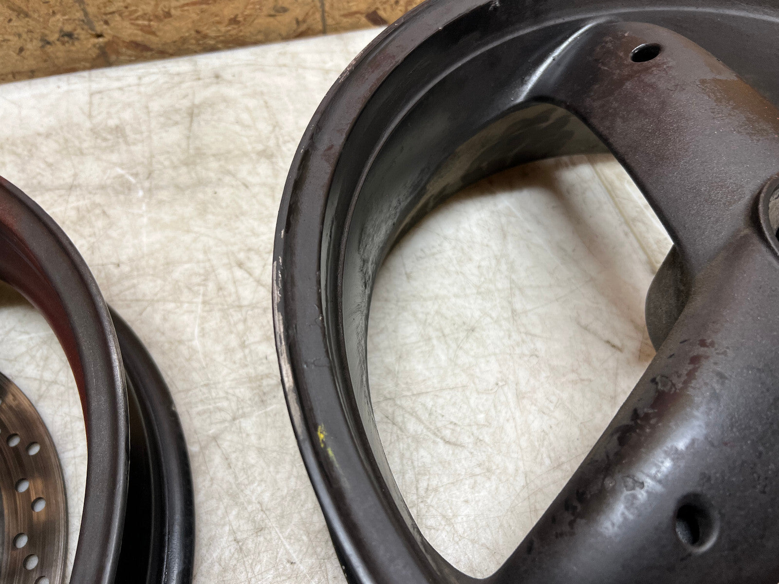 These wheels are straight and true and come complete with brake rotors. Wheels have some over spray on them and some poor painting skills however are still in fair condition considering the age. Would make great restoration project for your bike as they are quite rare these days, as seen in photos.