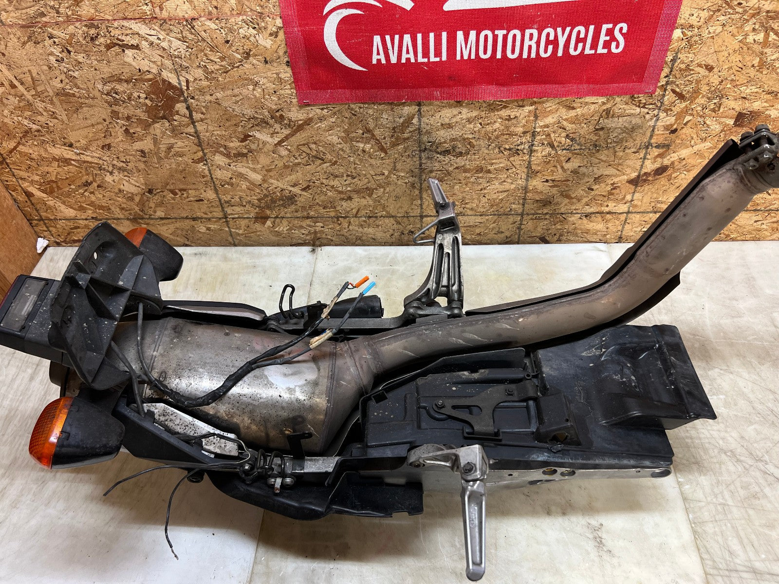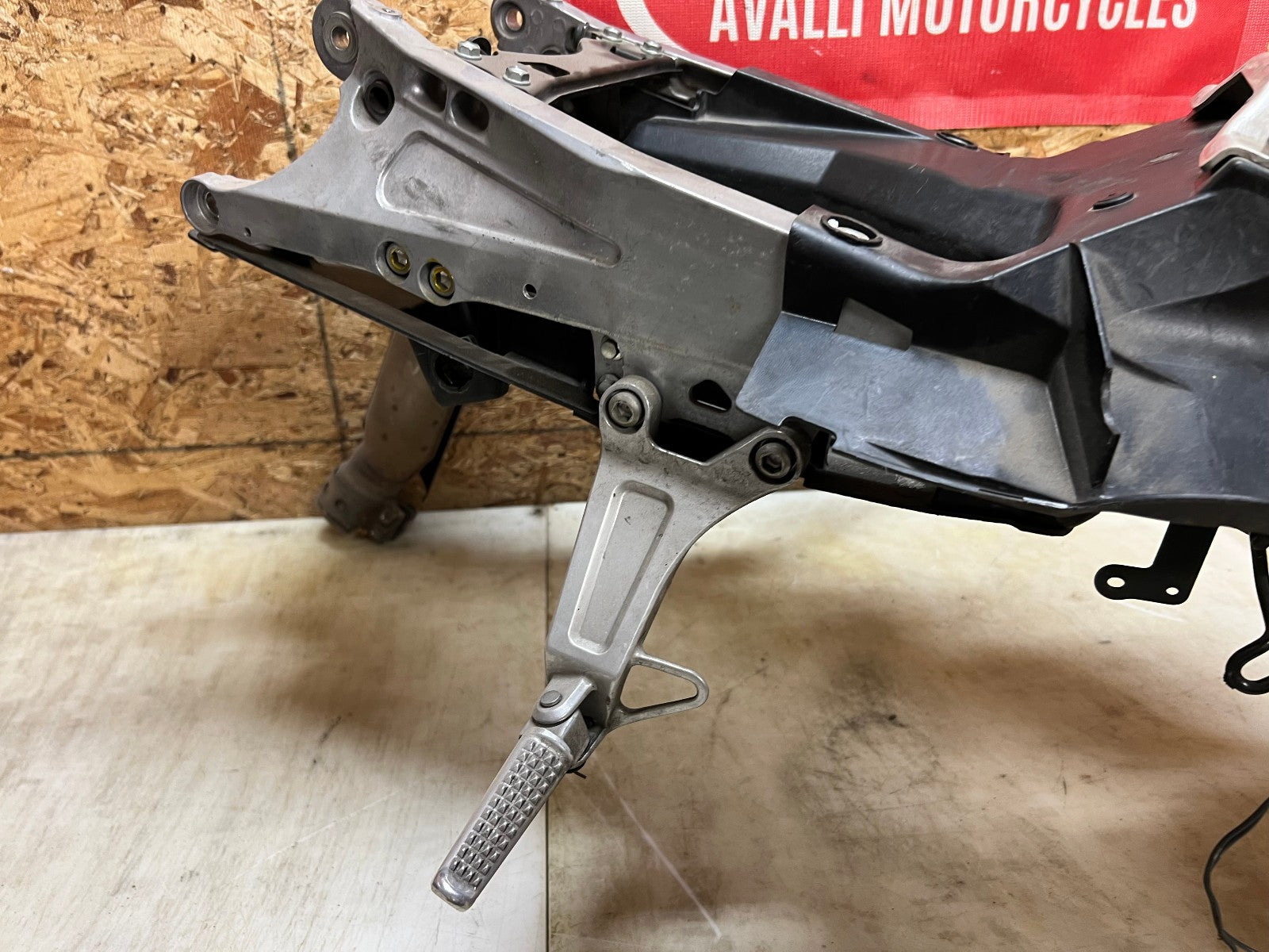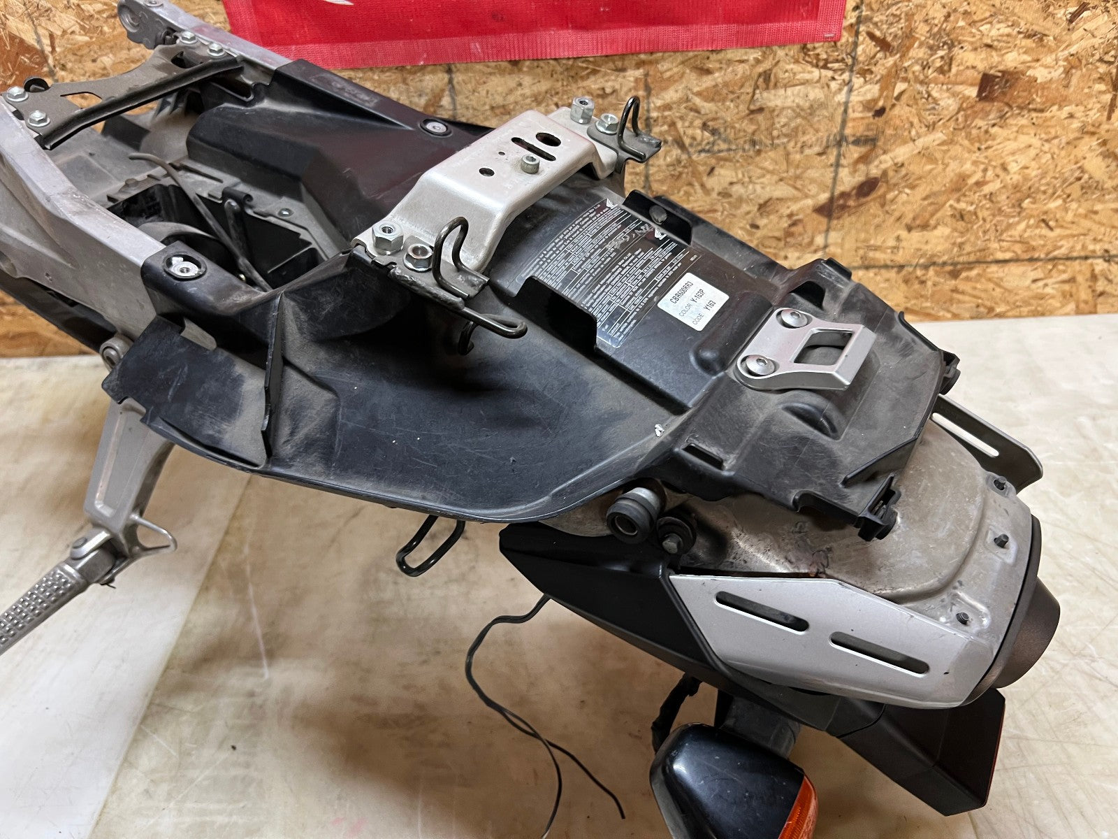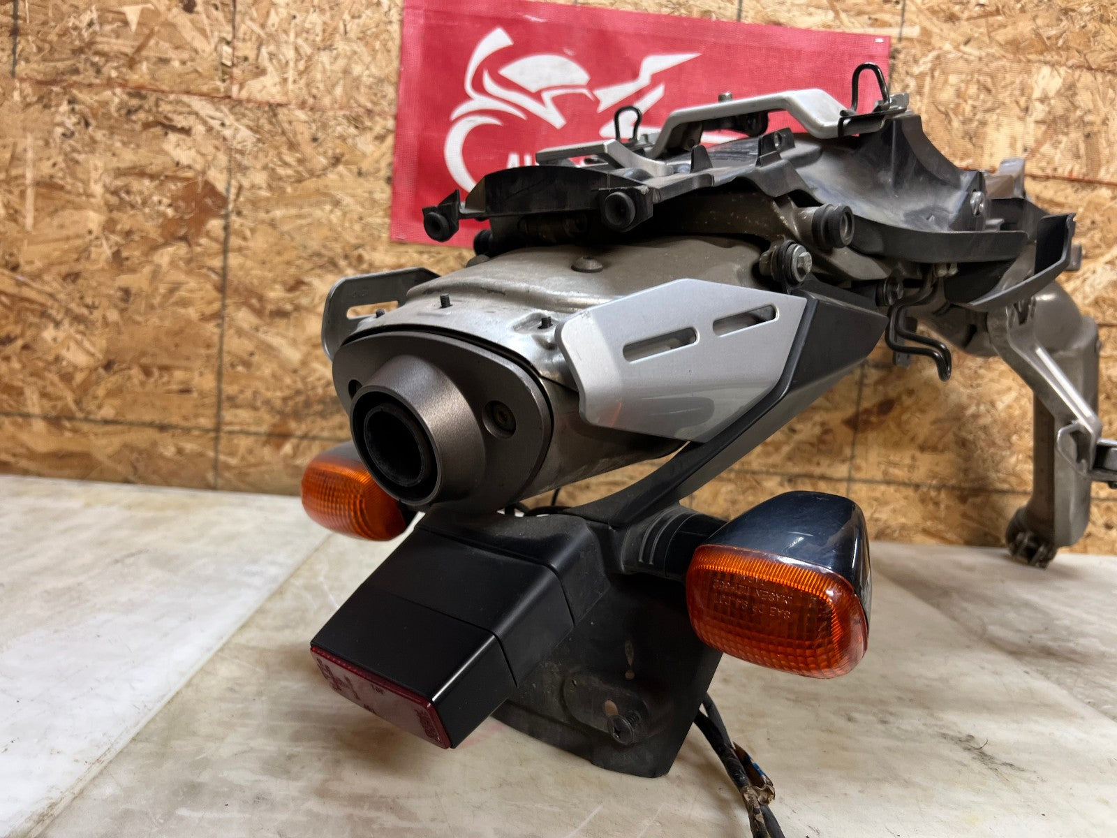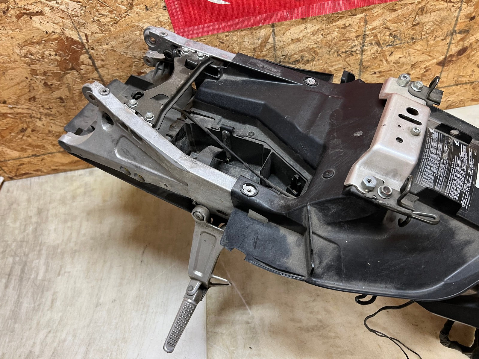This subframe is in excellent condition and is straight and true and comes complete with exhaust muffler and passenger pegs along with license plate bracket and turn signals. The battery tray has one crack through the bottom of it as shown in the close up picture and the left passenger peg has some slight rash on it shown when in the closed position. The rear mud guard has also been trimmed a bit, as seen in photos.