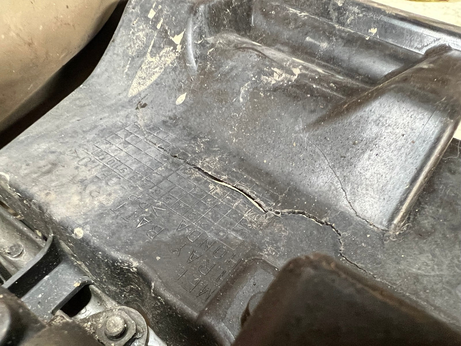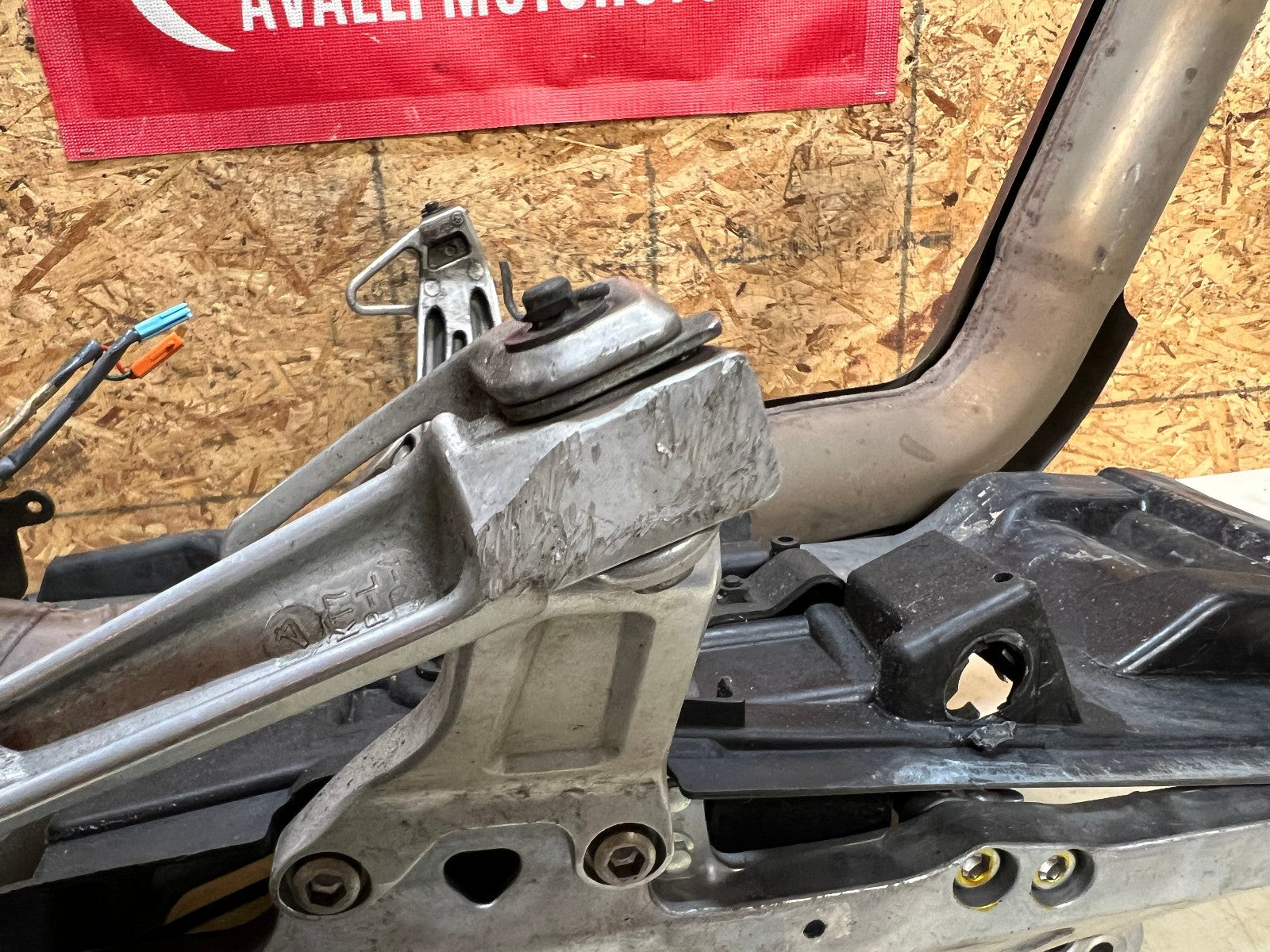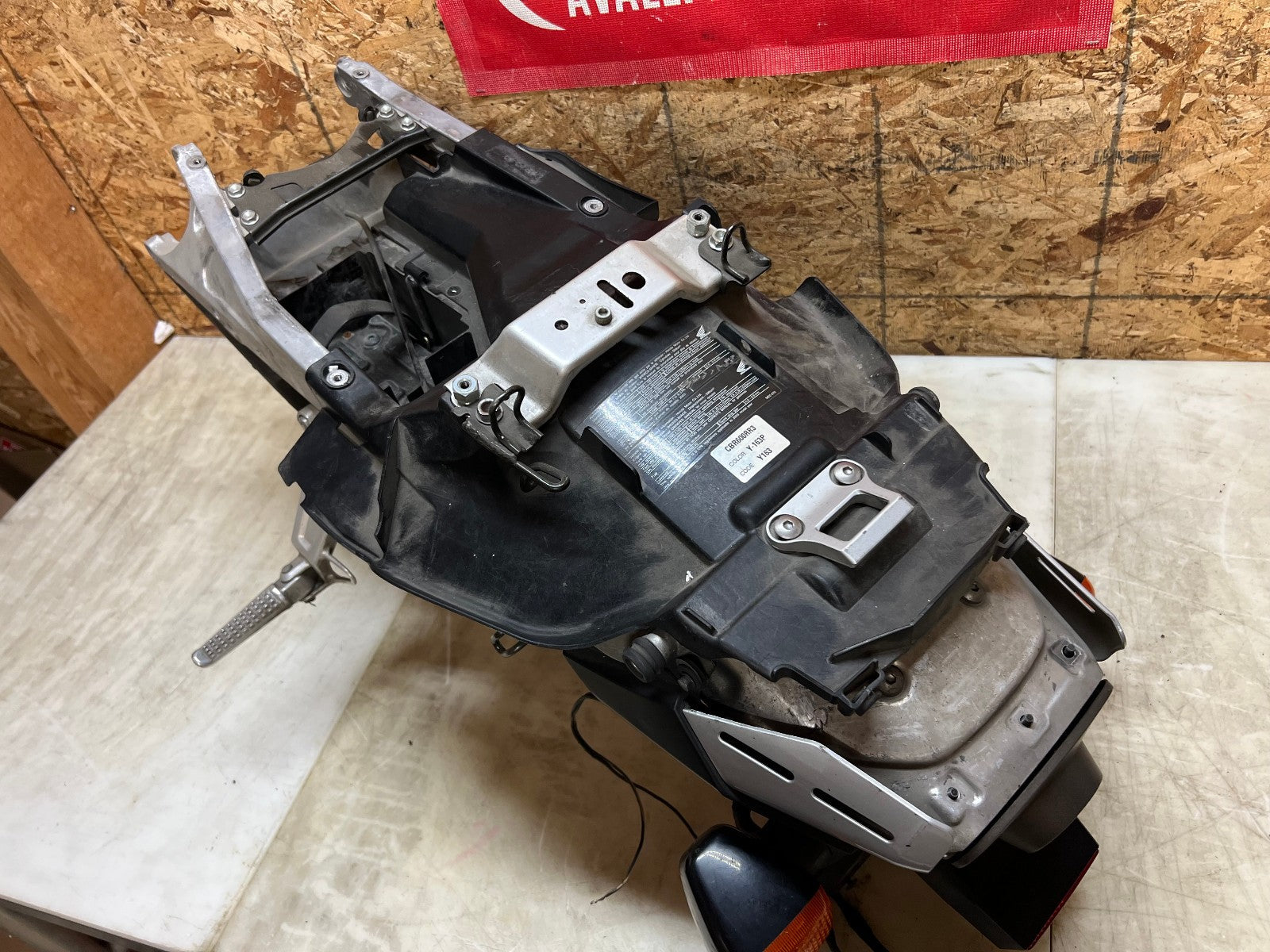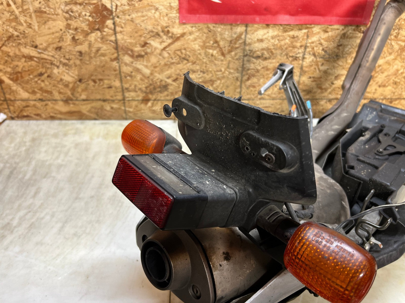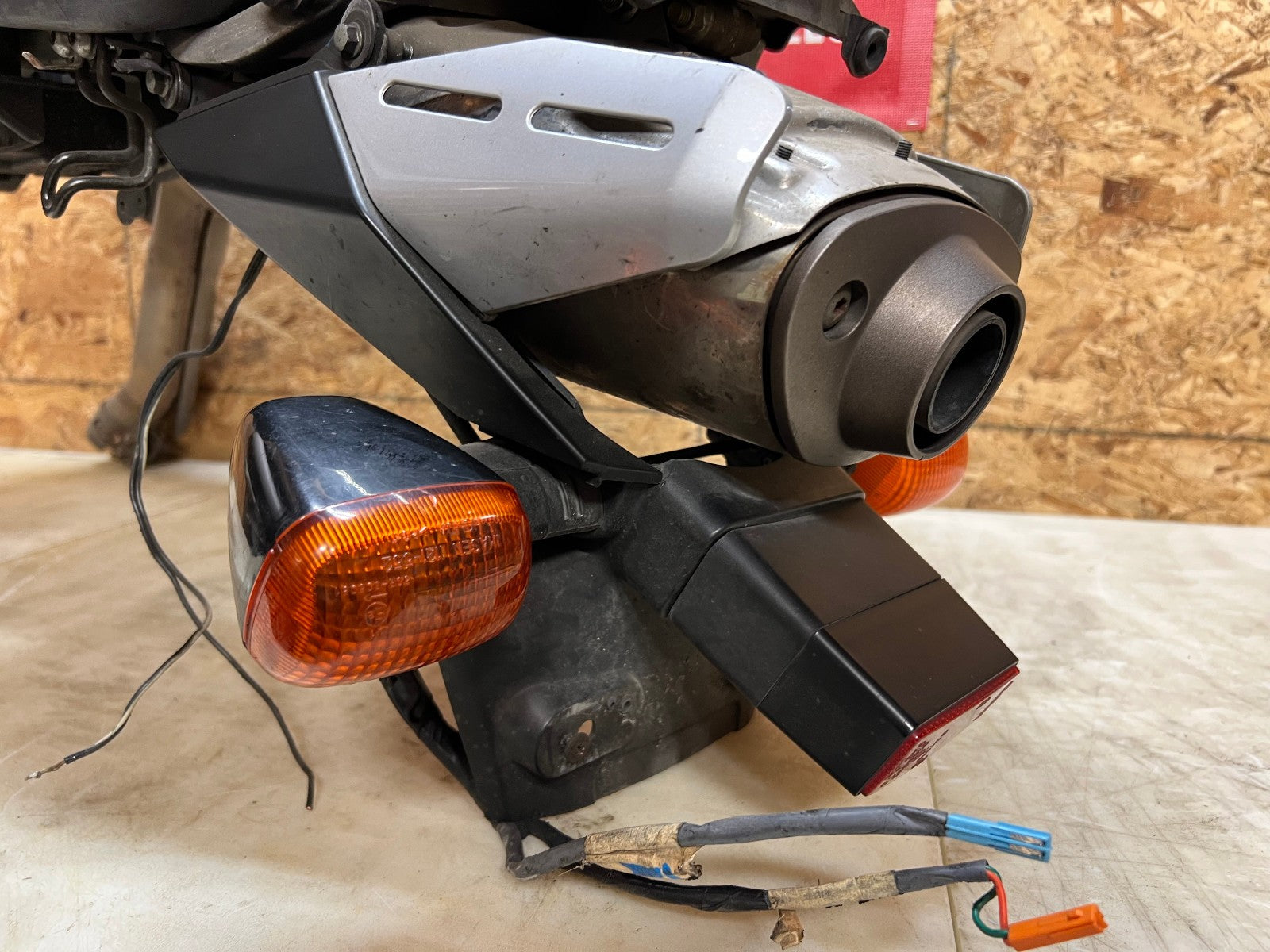 This subframe is in excellent condition and is straight and true and comes complete with exhaust muffler and passenger pegs along with license plate bracket and turn signals. The battery tray has one crack through the bottom of it as shown in the close up picture and the left passenger peg has some slight rash on it shown when in the closed position. The rear mud guard has also been trimmed a bit, as seen in photos.