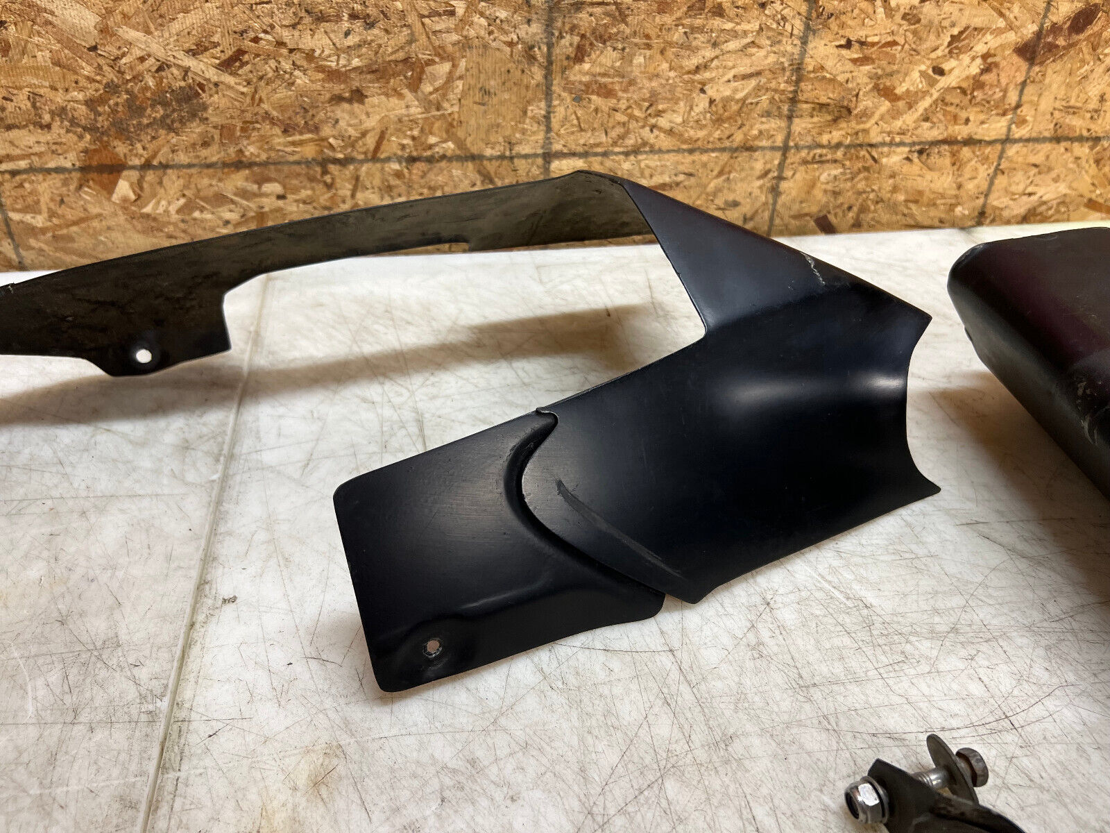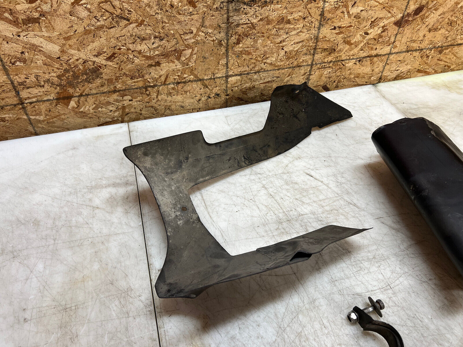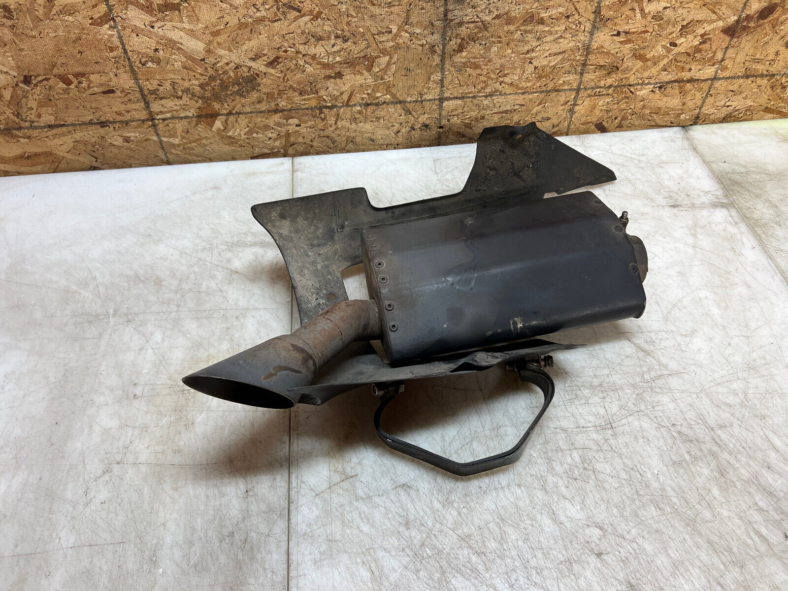 This exhaust is in fair condition and comes complete with hangar and lower fairing. There is a small dent in the can that is un noticed when installed and a little chip out of the carbon firber fairing. As seen in the pictures.