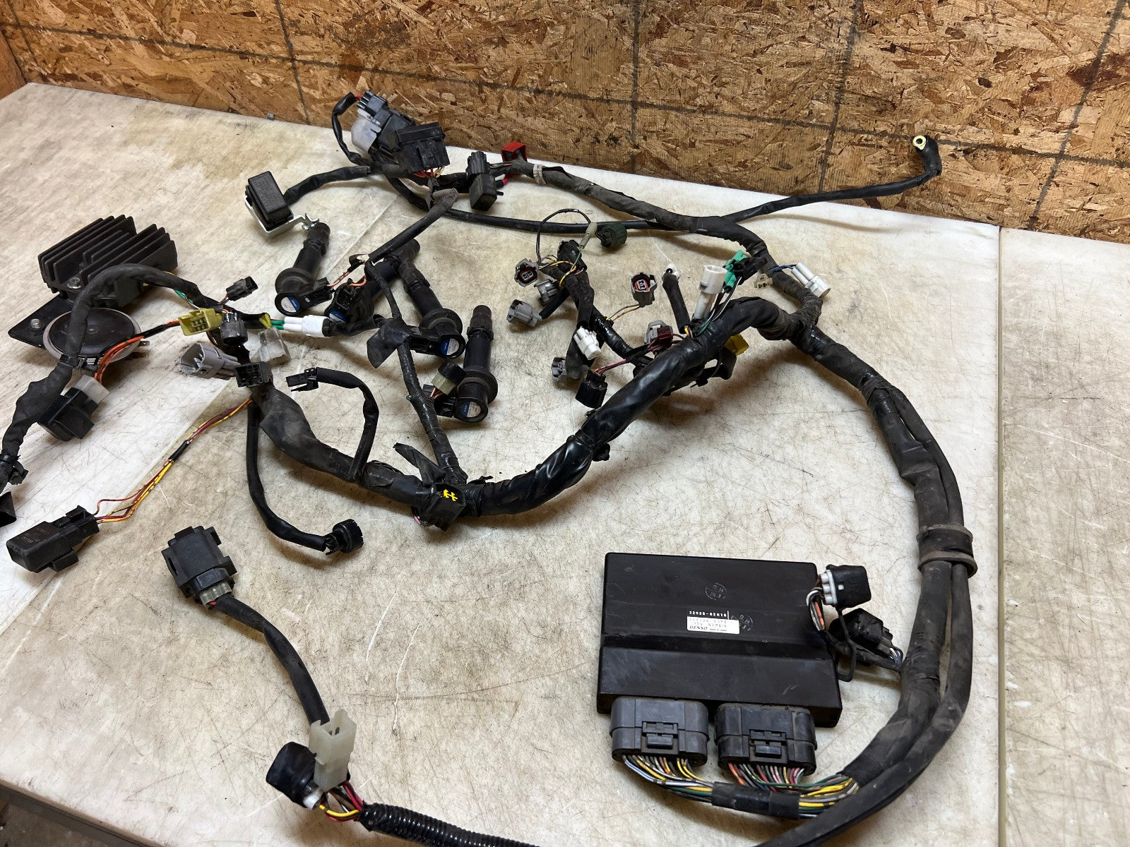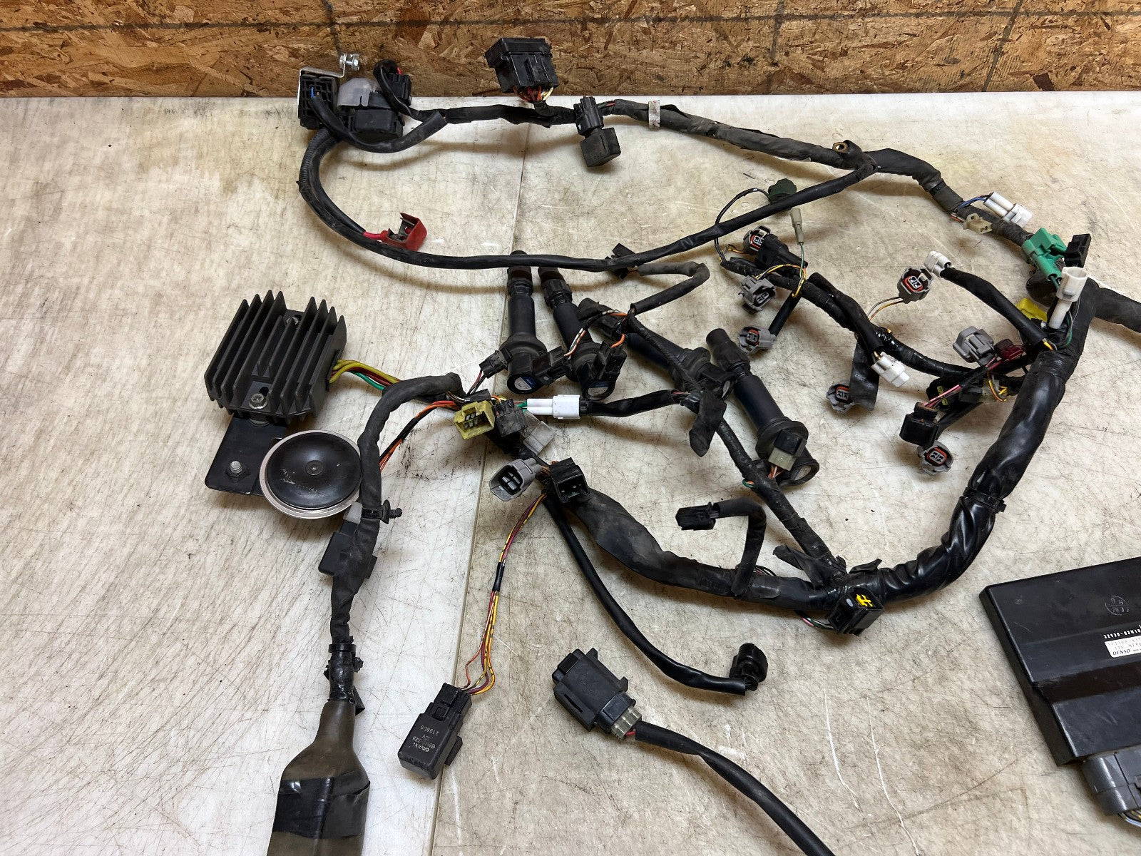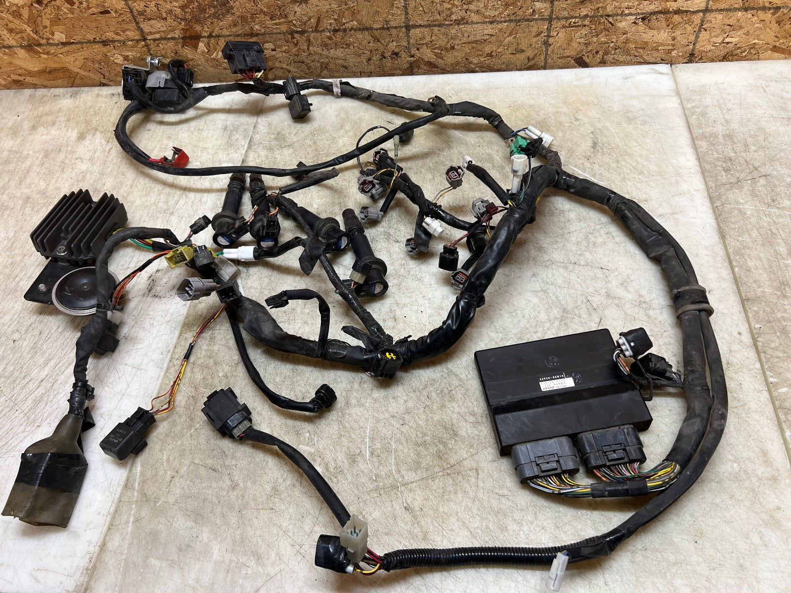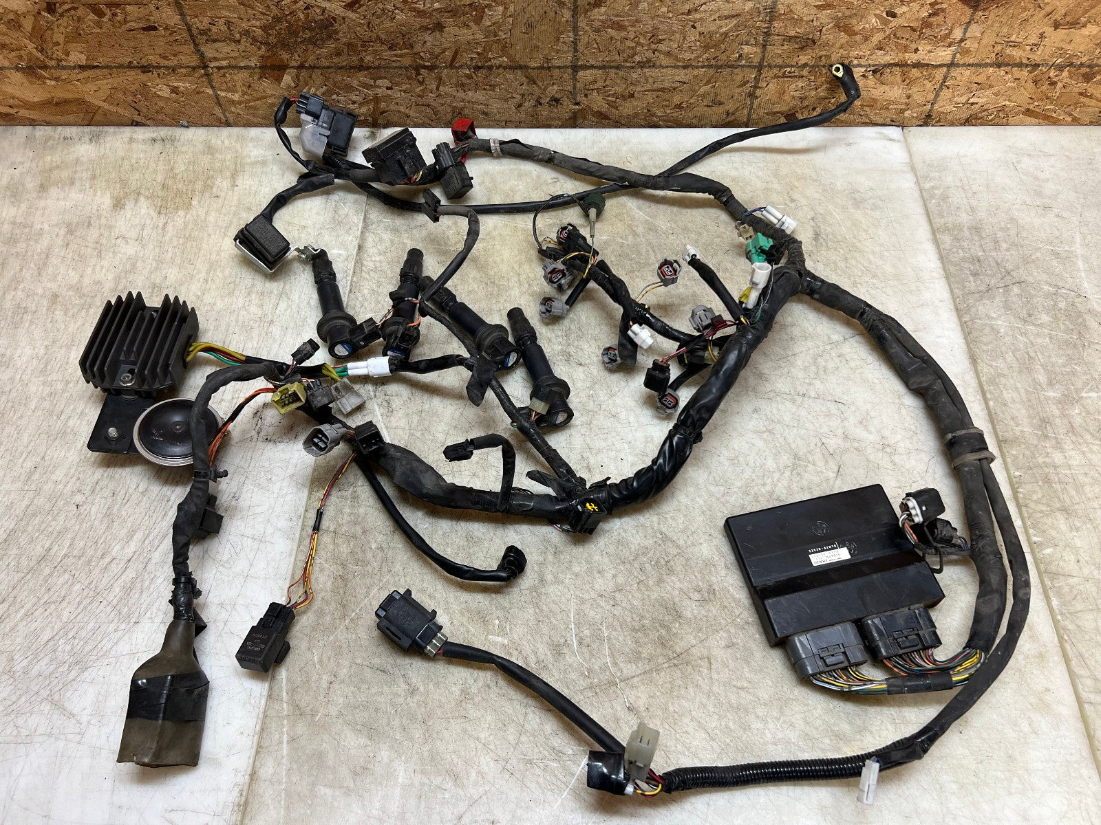 This wiring harness & ECU is in perfect working order and was tested before being removed as shown in the video below. Comes complete with regulator rectifier, starter relay and ignition coils. There are no broken plugs or stripped wires, as shown in the pictures.