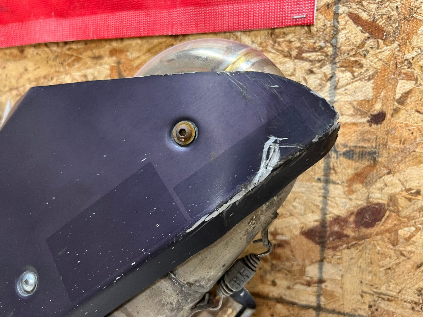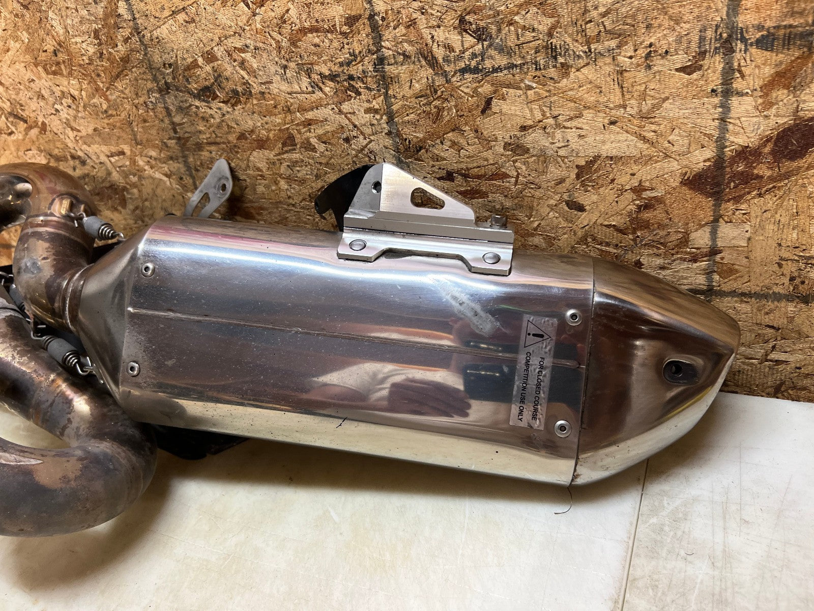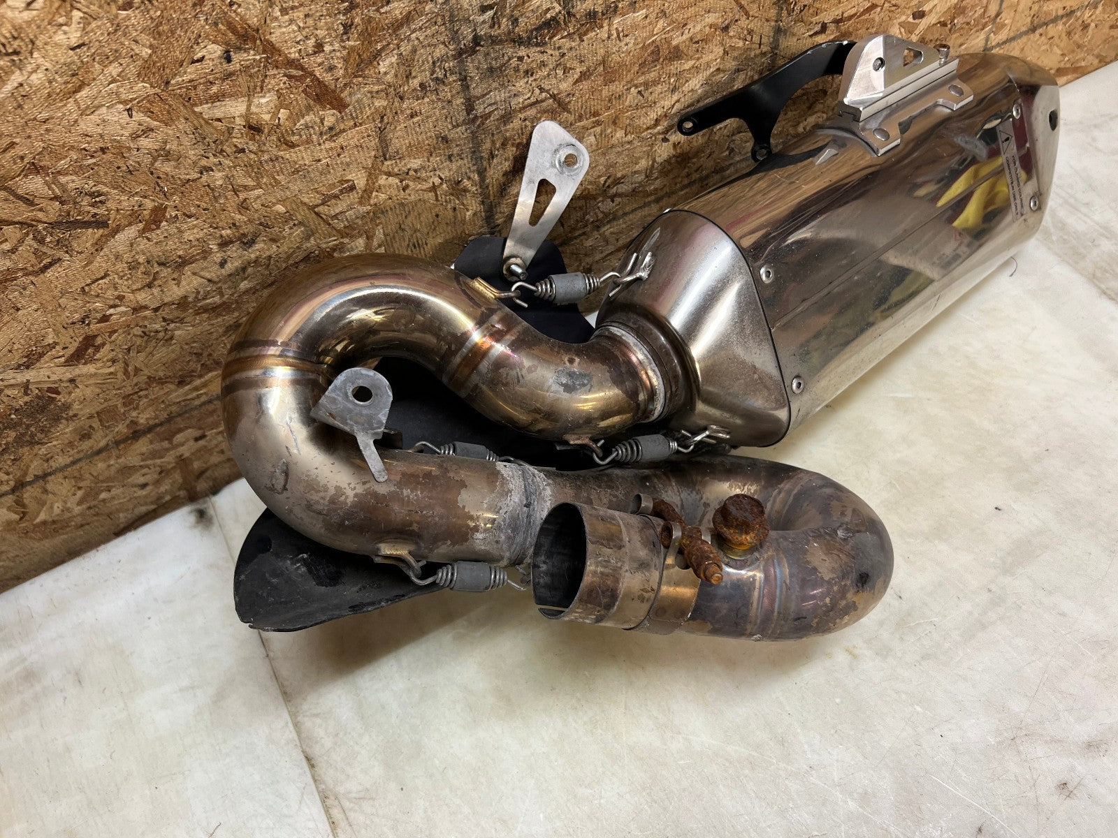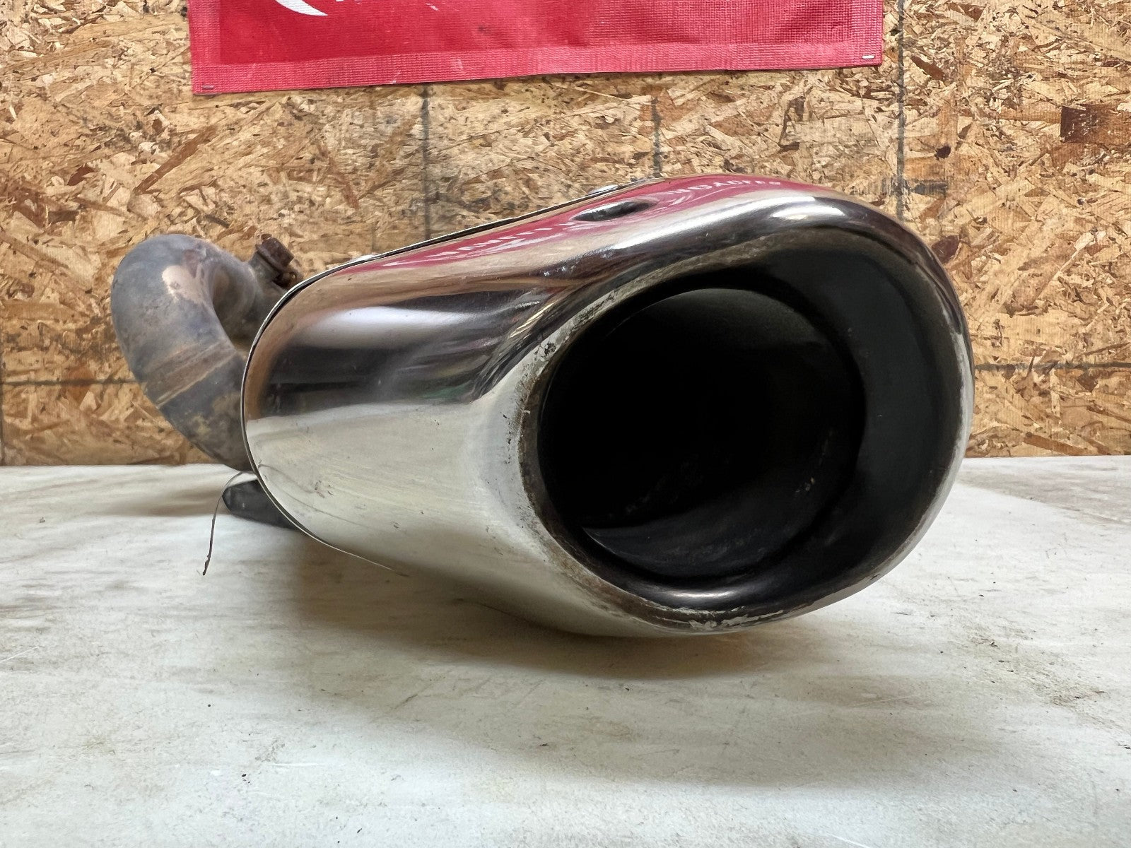 This exhaust is in fair condition with some light scratches on the outer tip of the pipe along with a bit of damage on the heat shiel, as seen in the pictures.