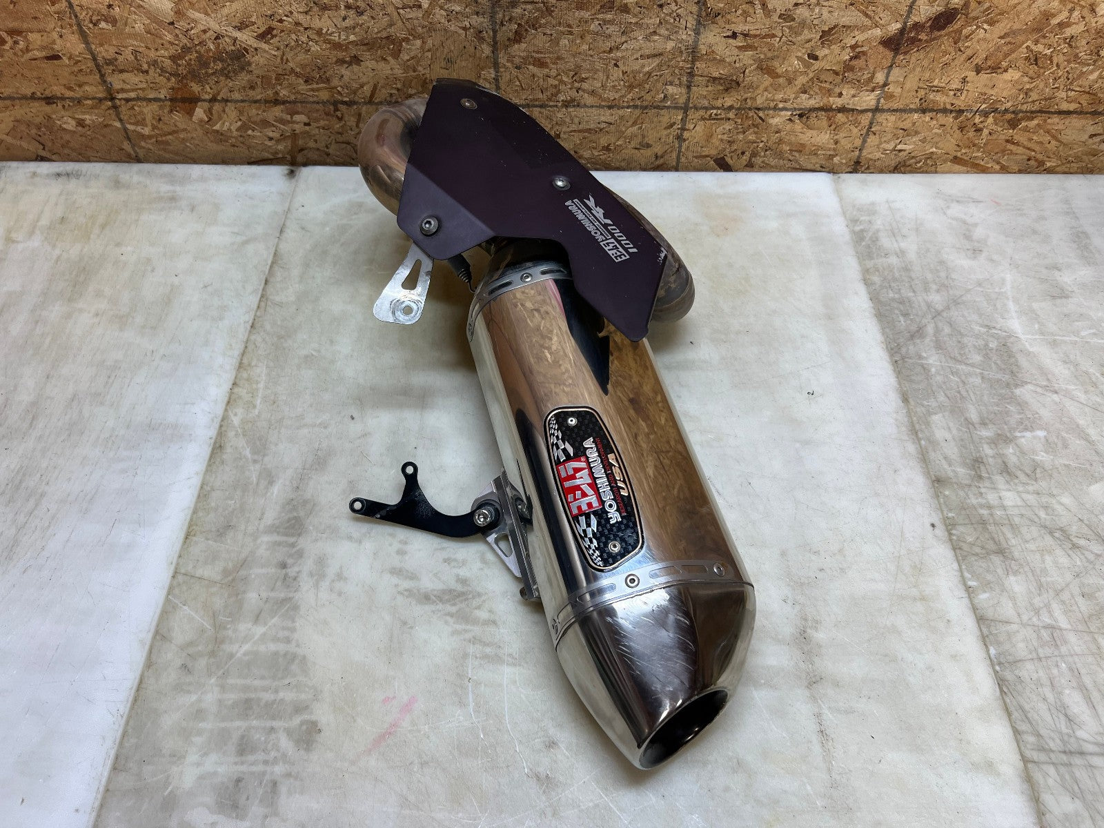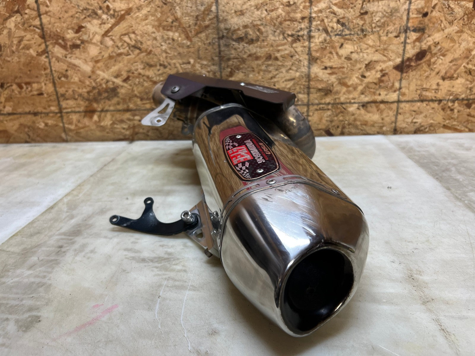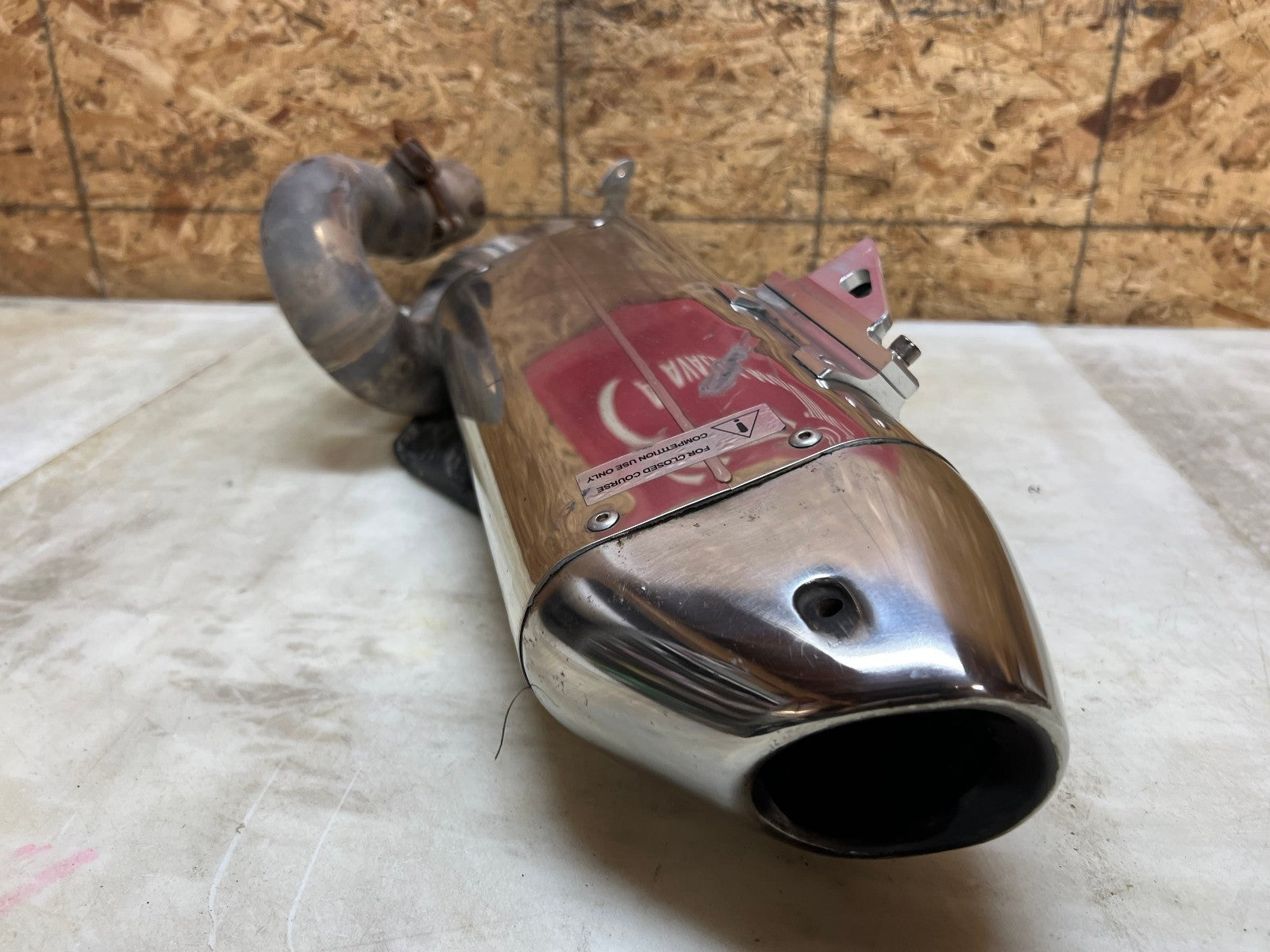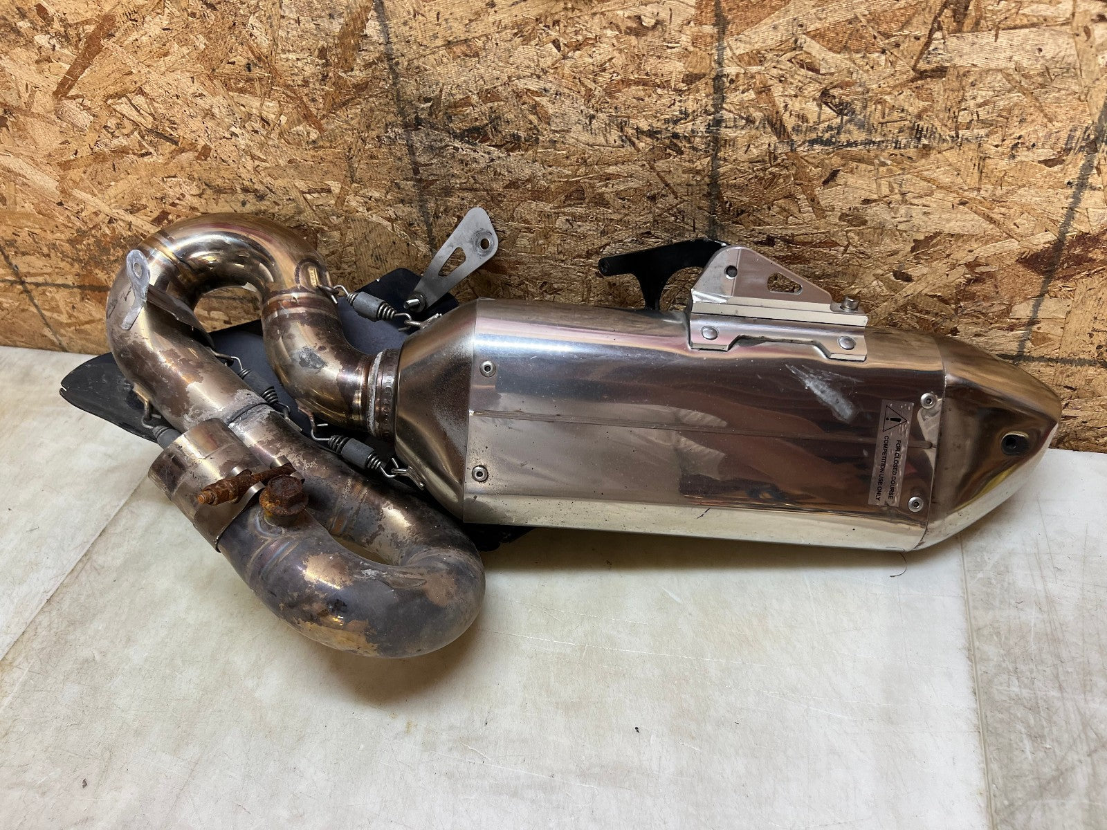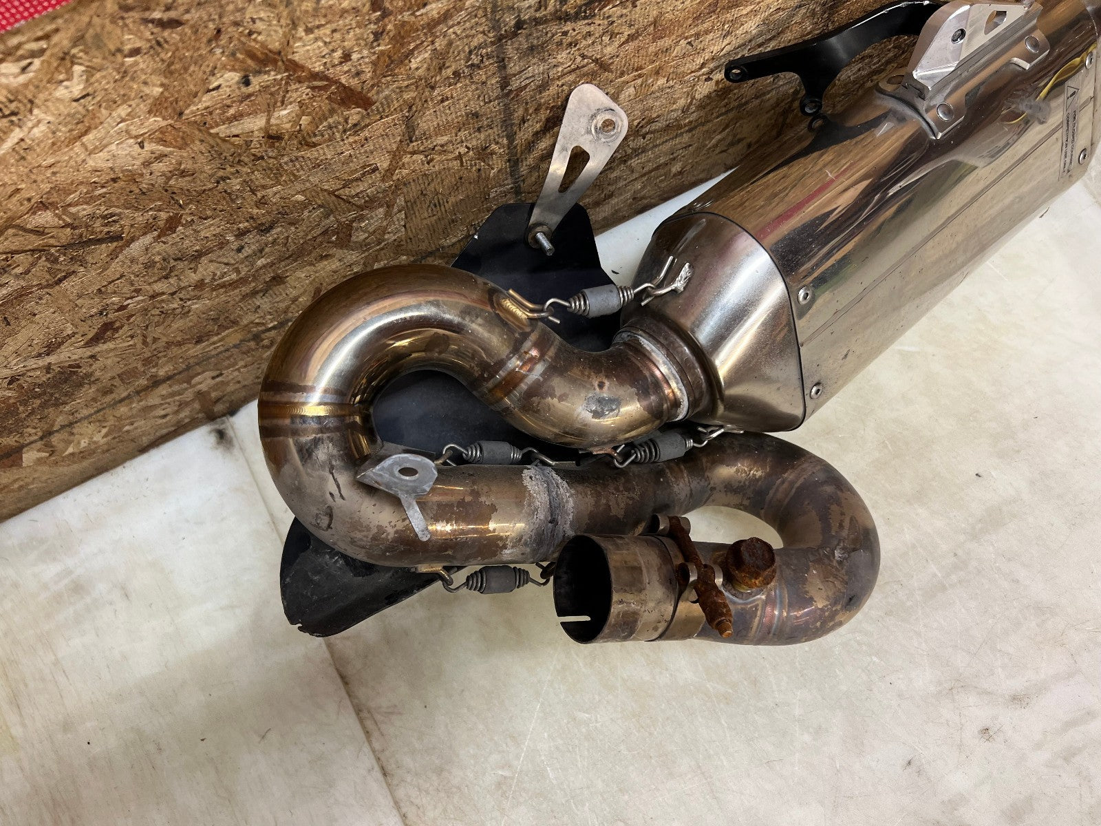 This exhaust is in fair condition with some light scratches on the outer tip of the pipe along with a bit of damage on the heat shiel, as seen in the pictures.