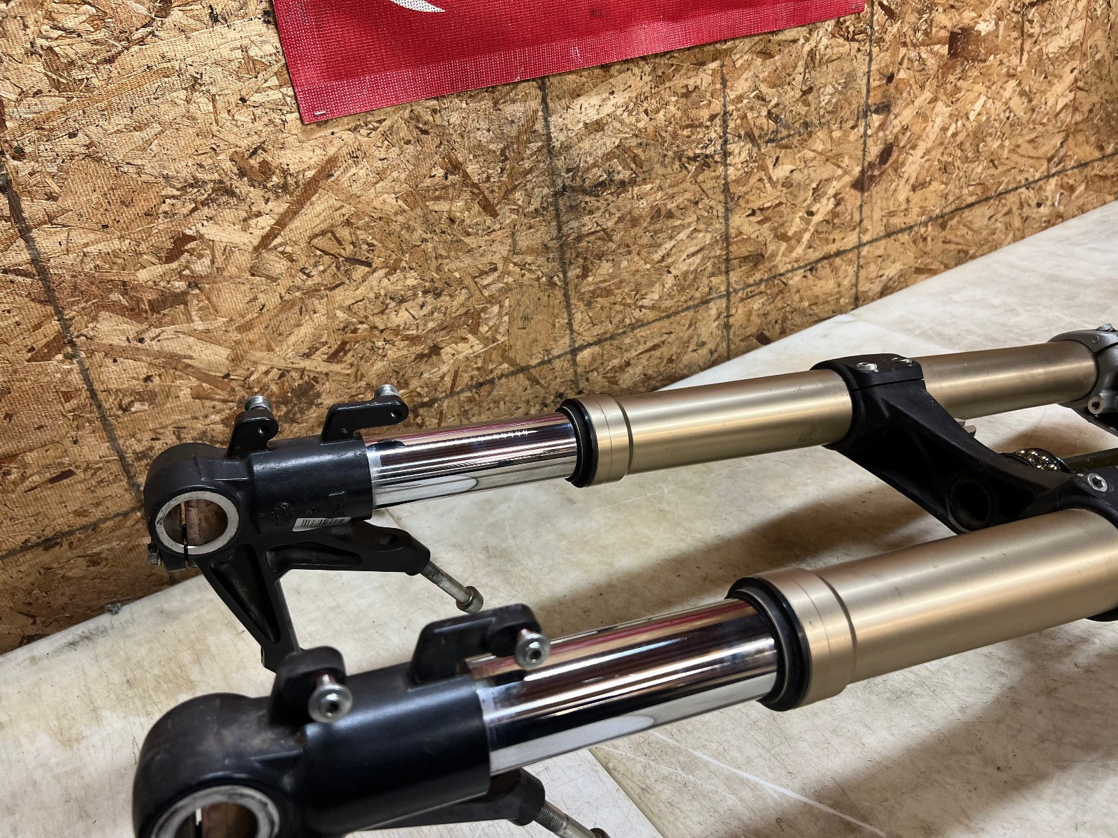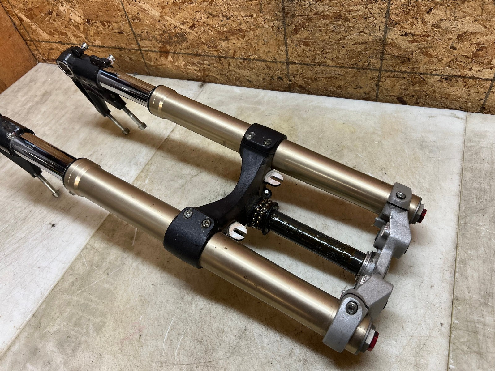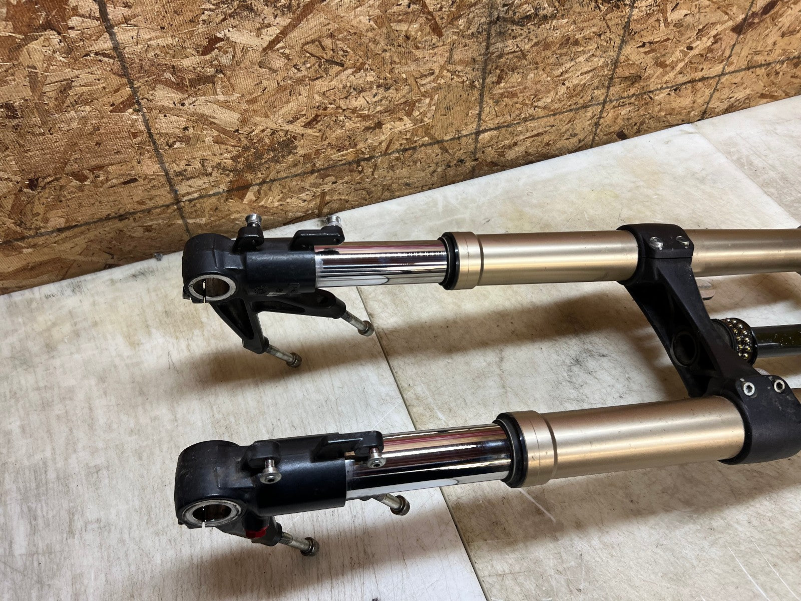 These forks are in excellent condition and are straight and true with NO leaks. These forks came from a bike that was not involved in an accident of any kind as shown in the last few pictures. They come complete with upper and lower triple trees, as seen in the pictures.