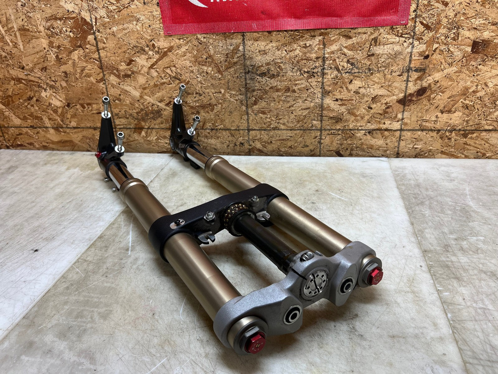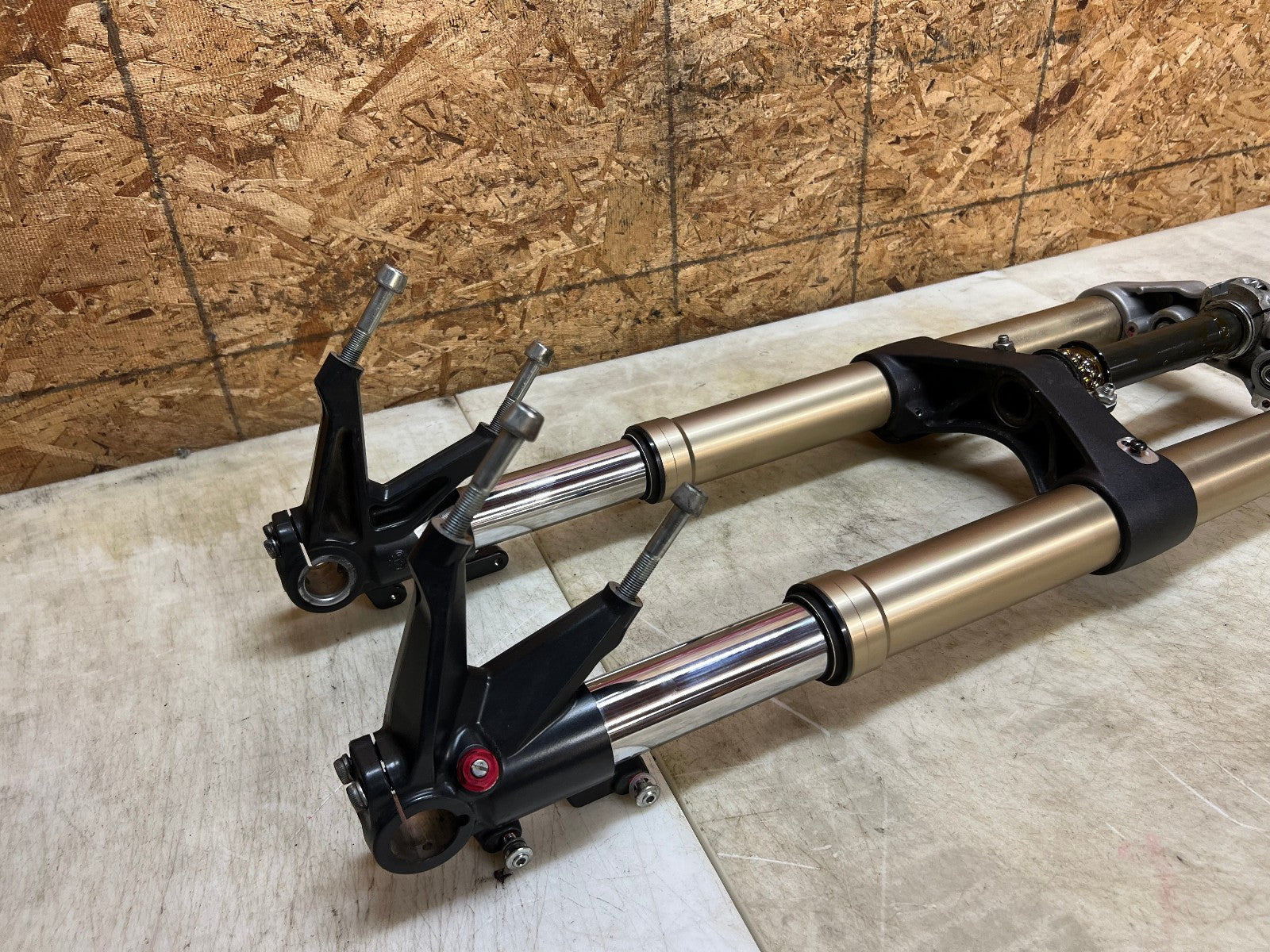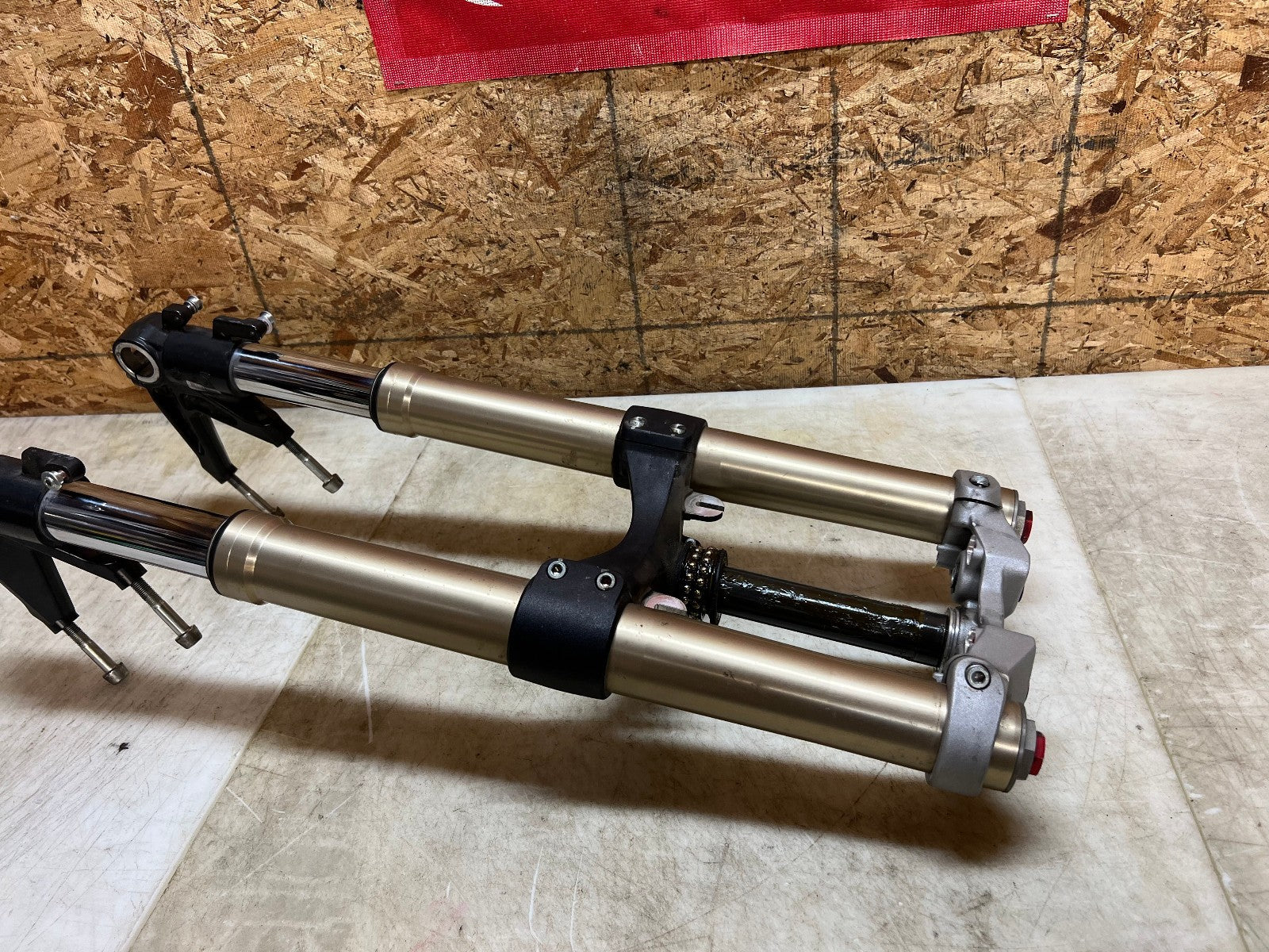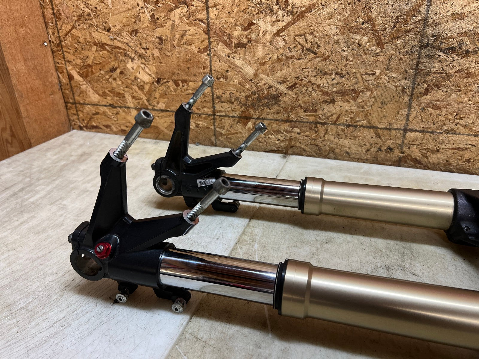 These forks are in excellent condition and are straight and true with NO leaks. These forks came from a bike that was not involved in an accident of any kind as shown in the last few pictures. They come complete with upper and lower triple trees, as seen in the pictures.
