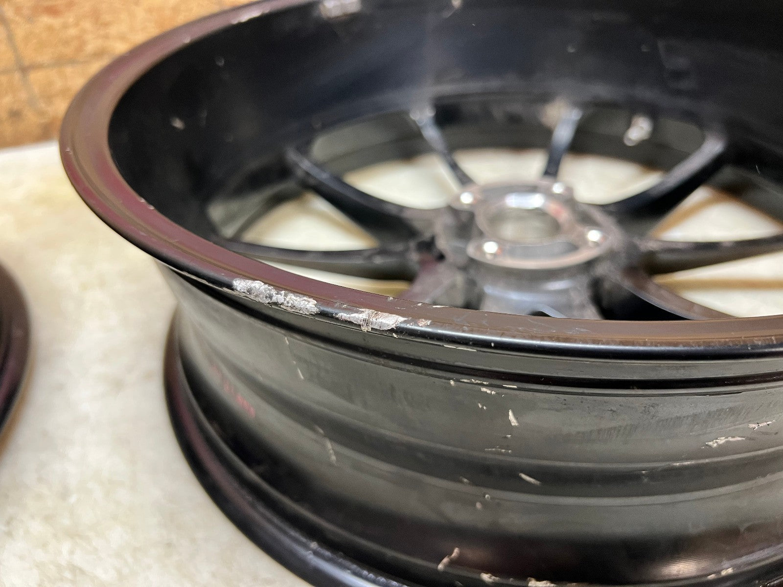 These wheels are in excellent condition and are straight and true and the front wheel comes complete with brake rotors and wheel spacers. The rear wheel has some slight damage here and there shown in the close up pictures, looks like possible tire changing marks but no dents or wobbles, came from a bike that was not involved in an accident of any kind as shown in the last 3 pictures, as seen in the pictures.