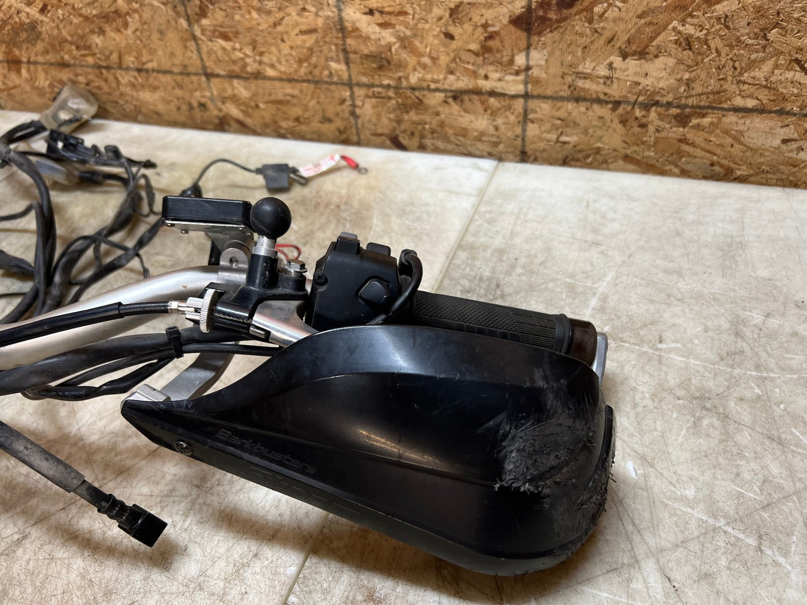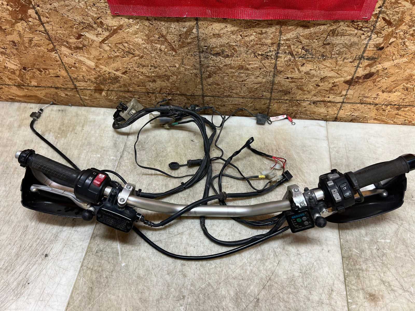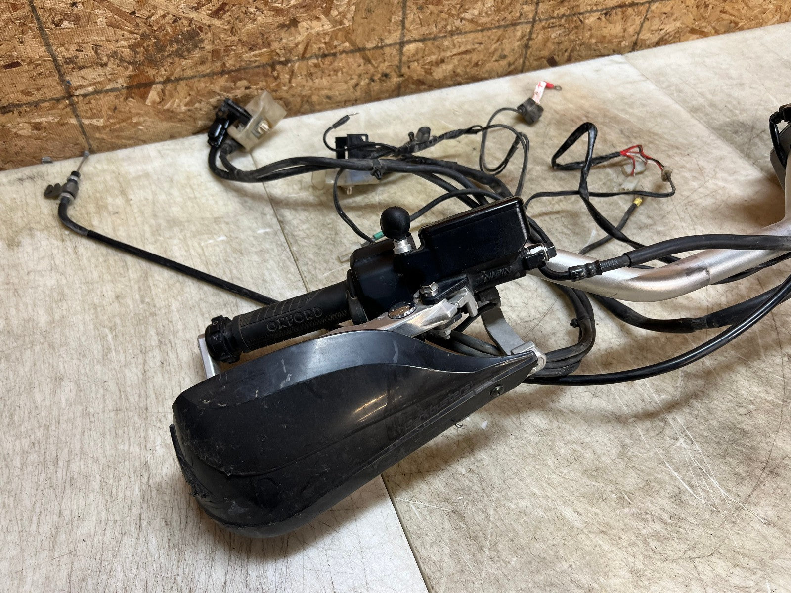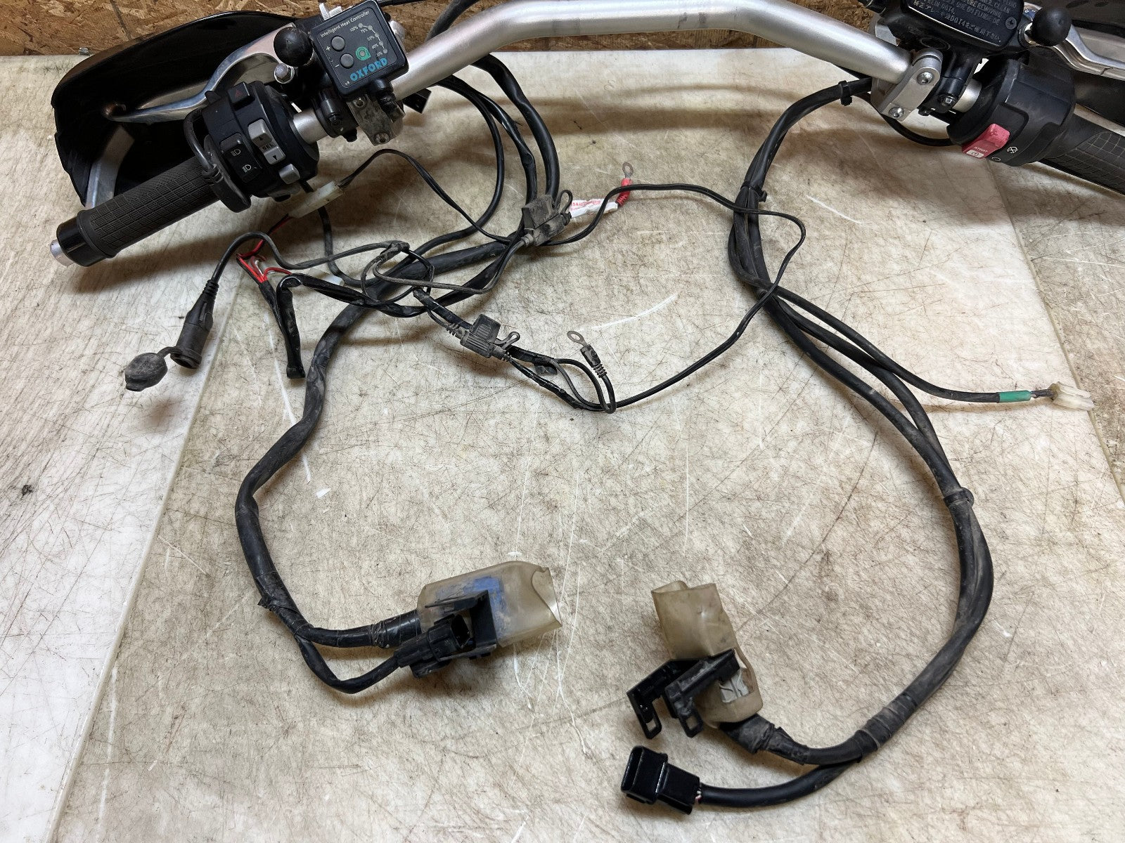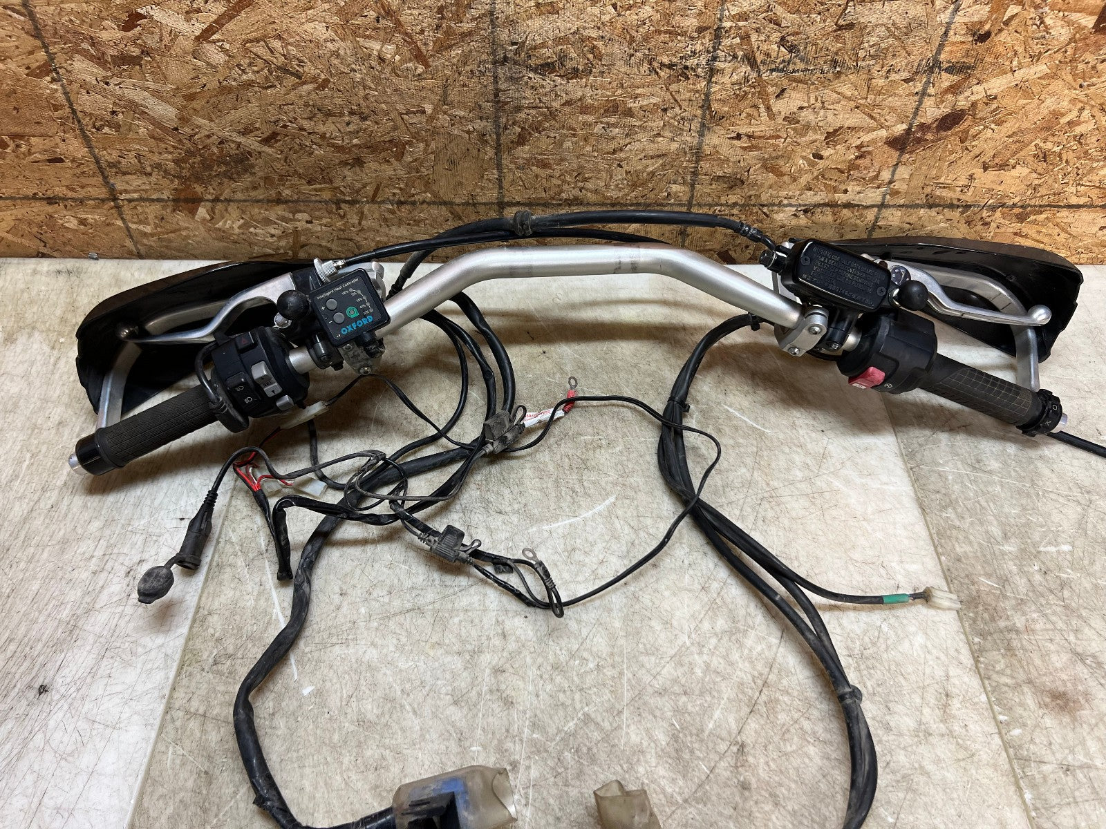 These handlebars are in excellent condition and come fully complete as shown with all the switch cube controls for headlights and on and off switch. This set up also comes complete with the brake master cylinder along with clutch perch and clutch cable. This set up ALSO comes with Oxford heated grips with the controller and associated wiring. Also along with this package is some BarkBuster hand guards which do have some slight damage to them shown in the close up pictures however are very usable. Please review the video below.