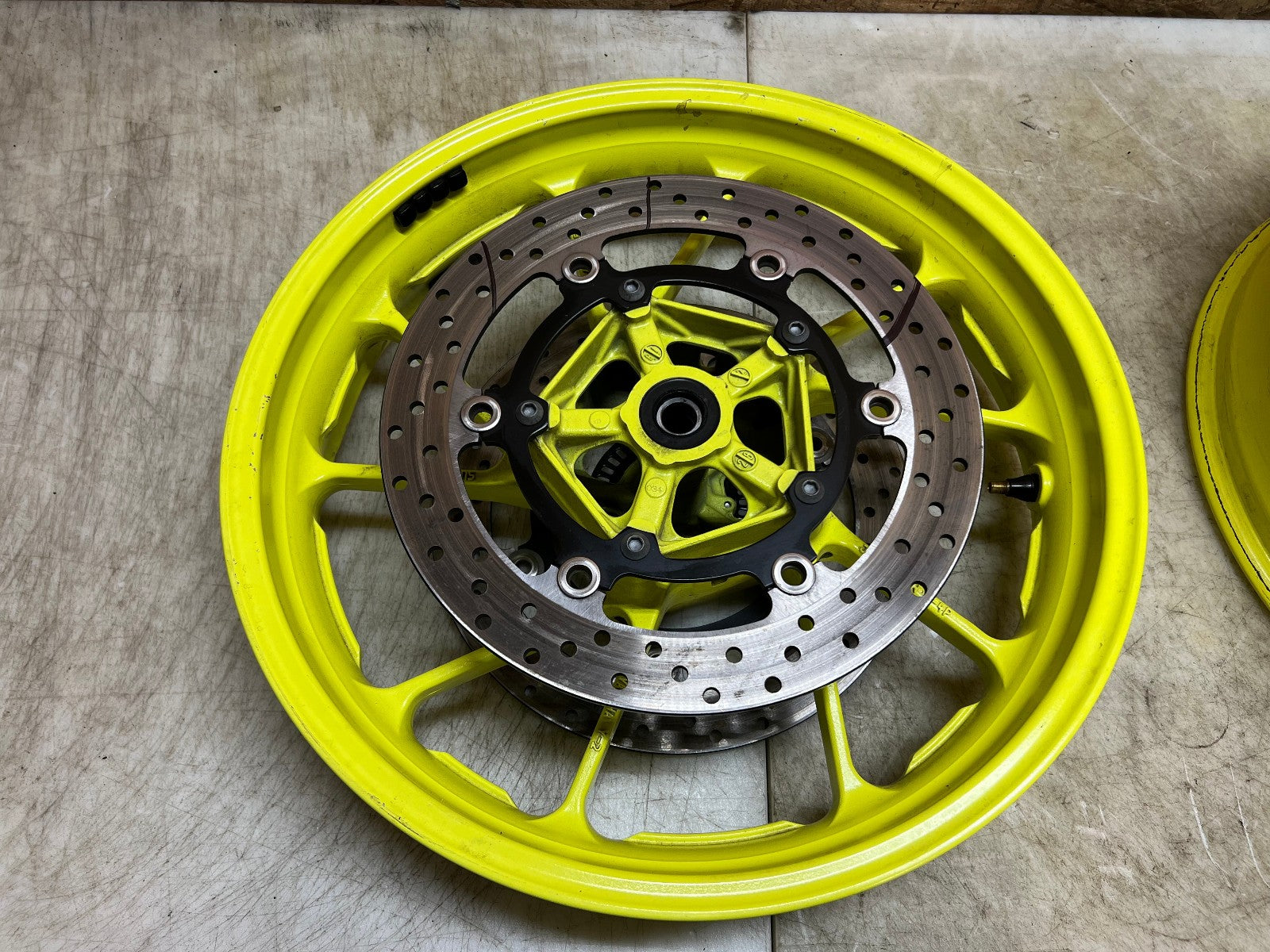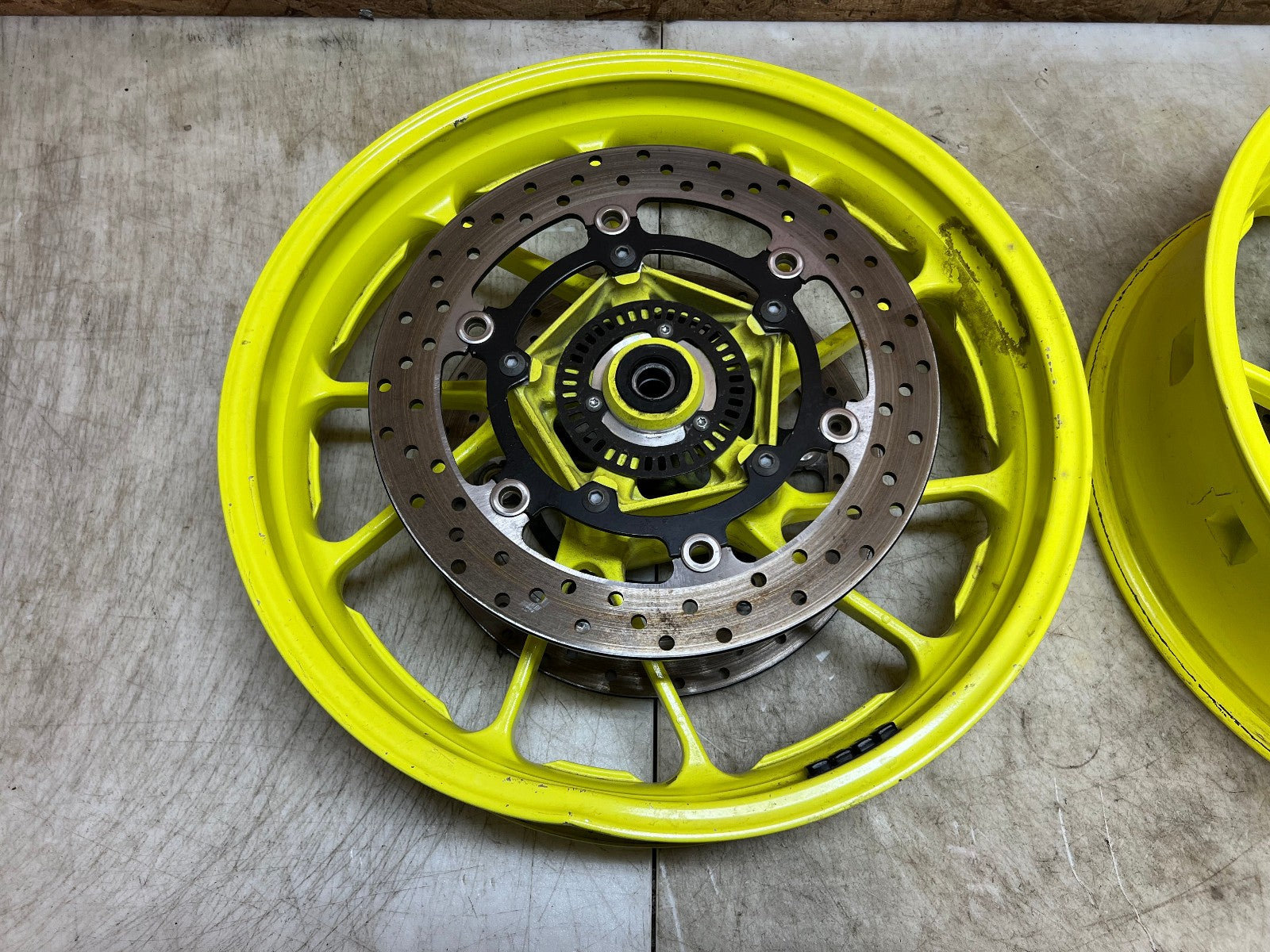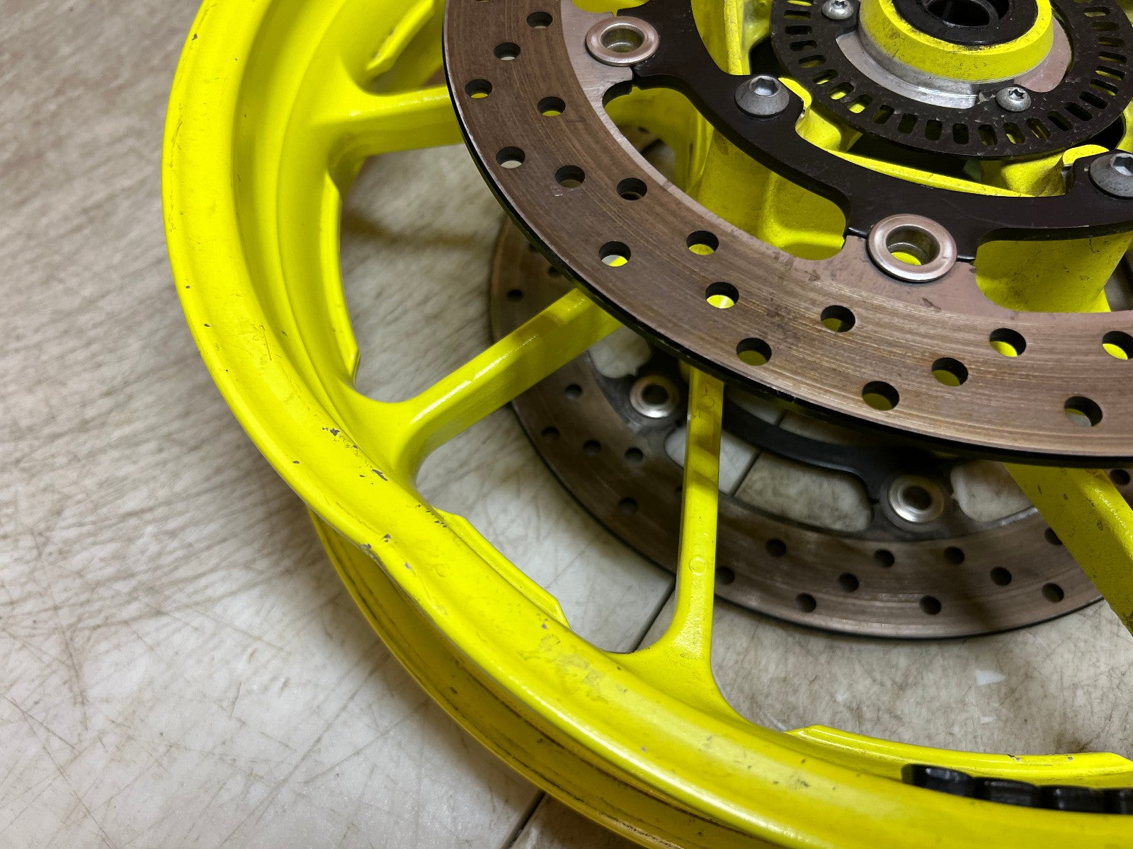 These front and rear wheels are in great shape however the Front wheel has sustained some damage to it. There is a large dent shown in the close up pictures along with a video which can easily be repaired by a wheel shop and the right hand brake rotor is bent and will need to be replaced. The back wheel is straight and true and in excellent condition and comes complete with cush drive and sprocket along with brake rotor. If you are not interested in buying the pair and only want the rear wheel there is a separate listing for the rear wheel only, as seen in photos.