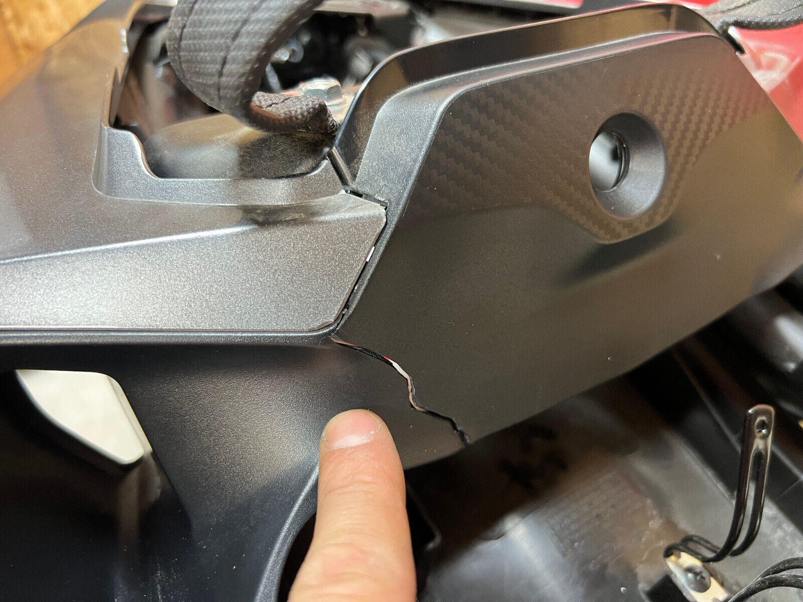 This subframe is in excellent condition and is straight and true and comes complete with battery tray, passenger pegs, license plate bracket and tail light along with the fairings. Both tail fairings have a bit of damage shown in the pictures, the right one has 2 cracks and the left has some rash to it along with the reflector. Subframe is still new with only 000,181 KILOMETERS WHICH IS 112 MILES. As seen in the pictures.