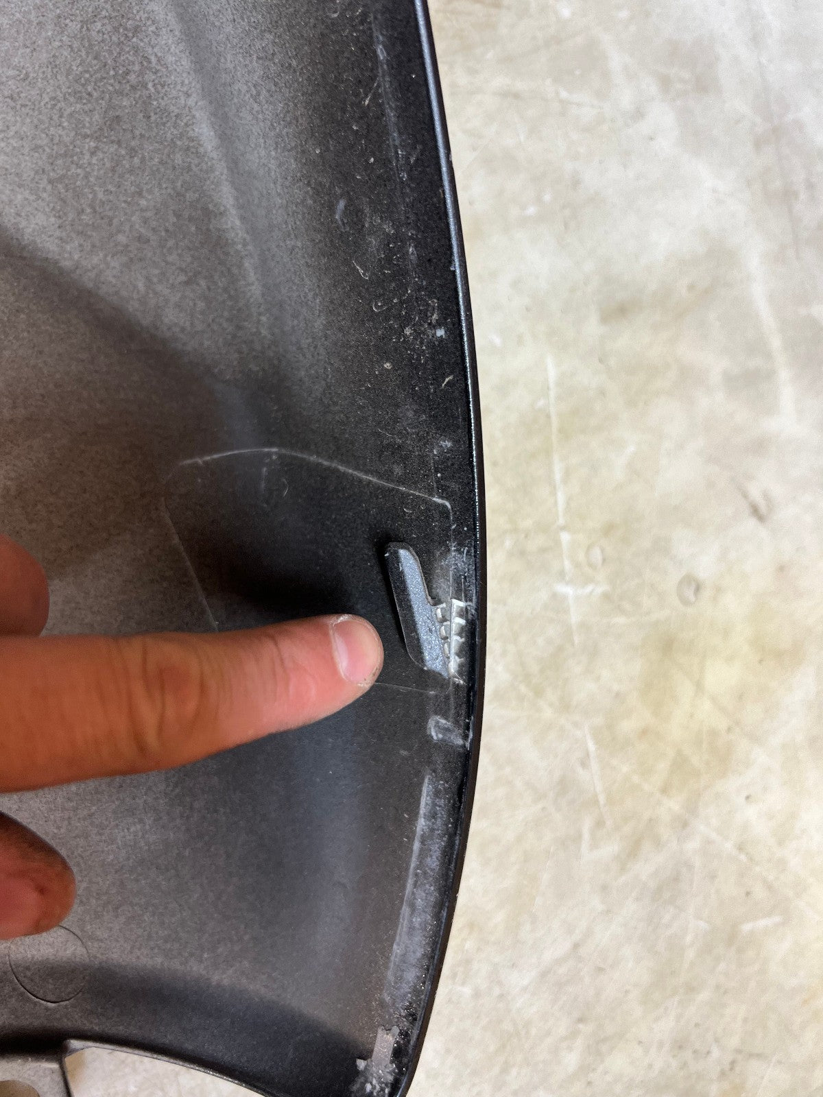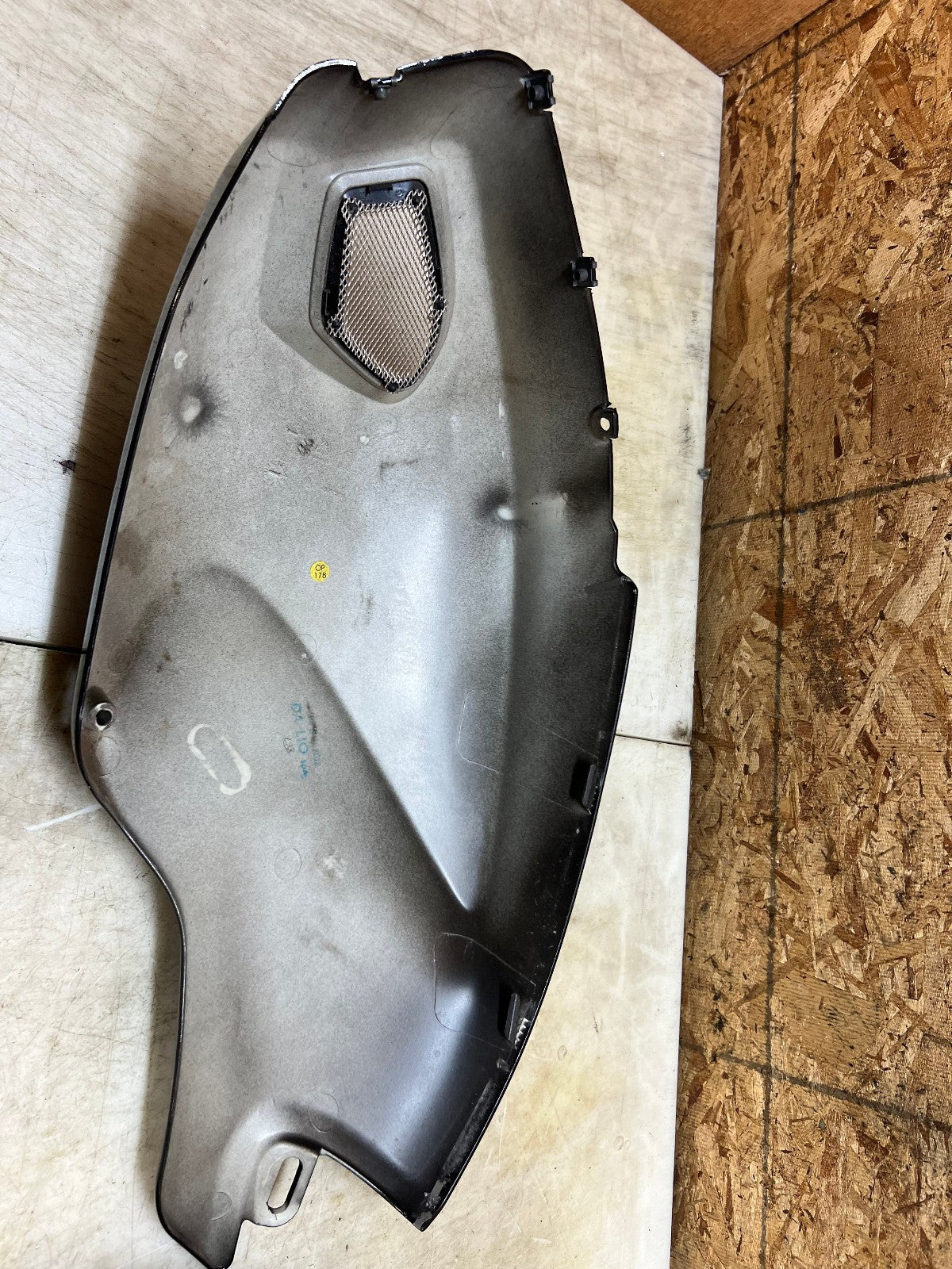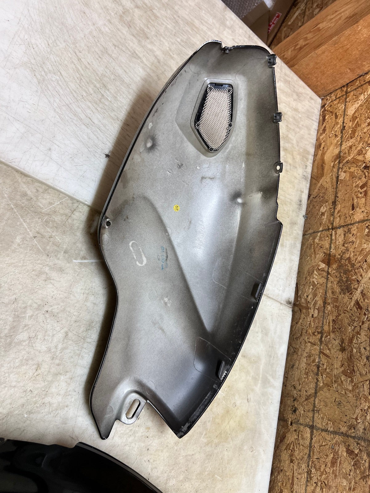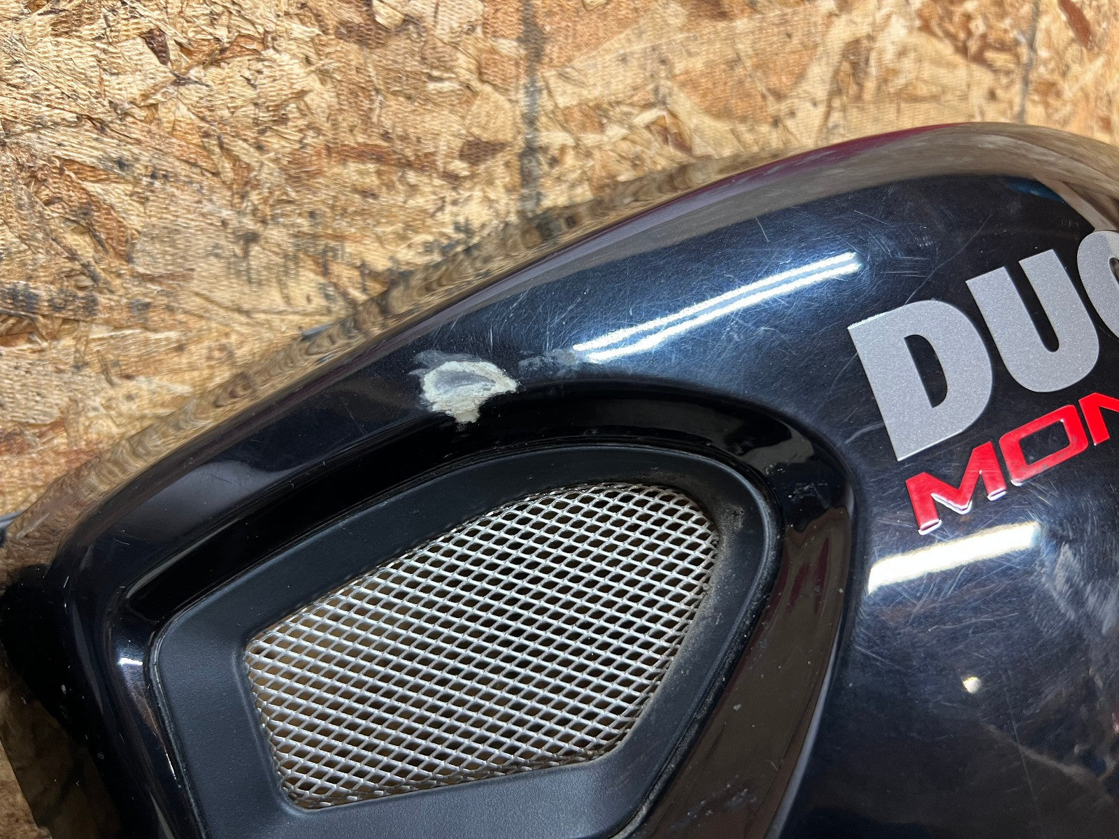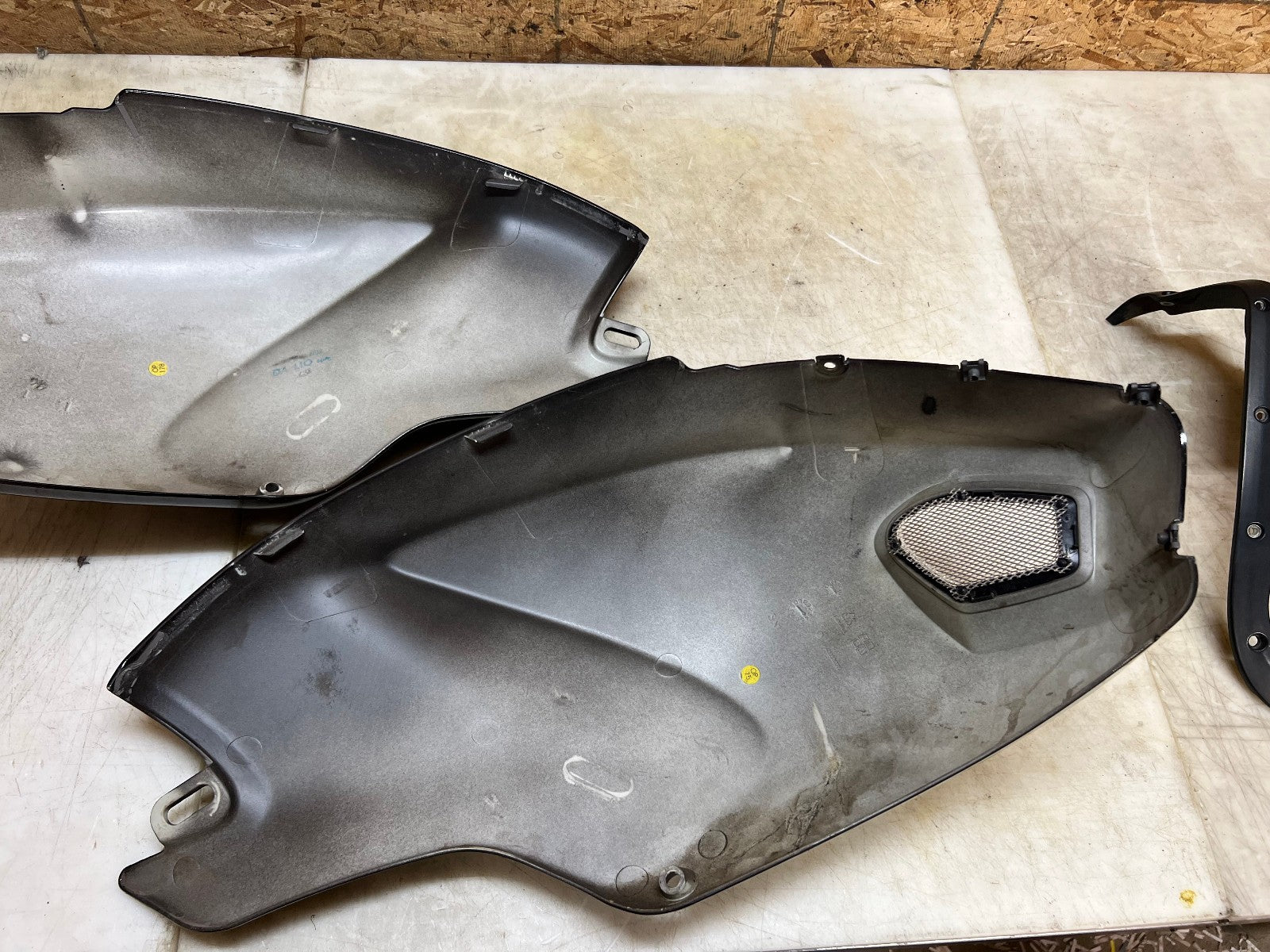 These tank fairings are in fair and usable condition however they are not perfect. There are lots of minor marks here and there from normal wear and tear and on the left fairing there is a small gouge near the vent shown in the close up picture and on the back side there is one slide in tab that is slightly broken, also shown in the close up picture, as seen in the pictures.