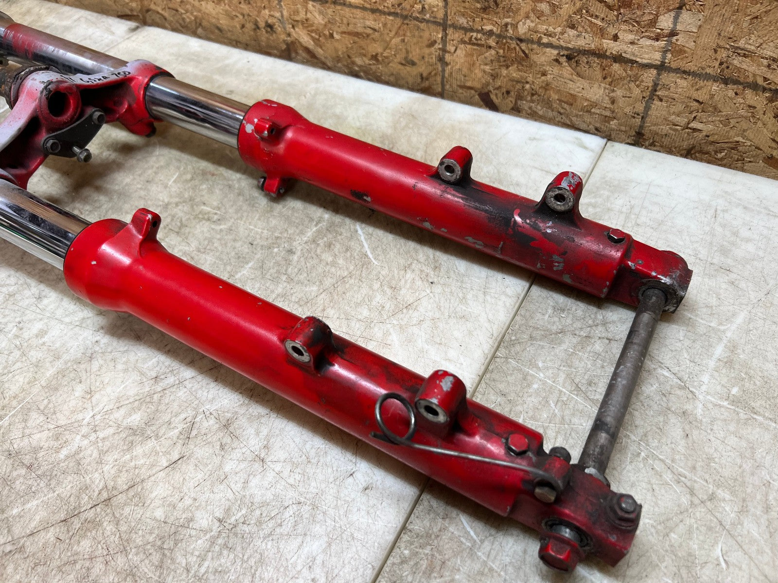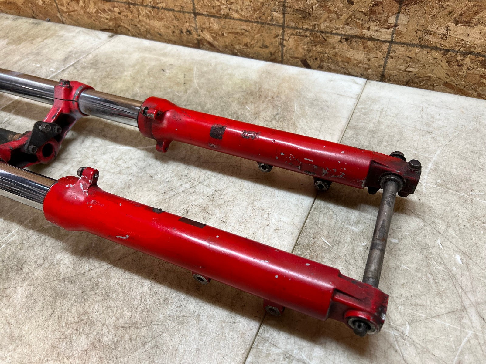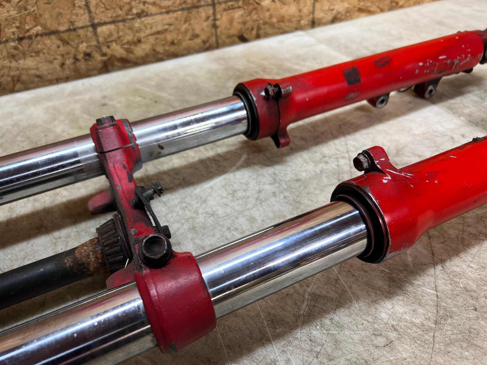 These forks are straight and true with no leaks. Forks have been spray painted and been sitting for some years and will require some elbow grease to bring them back to life. Excellent pair for your project, as seen in photos.